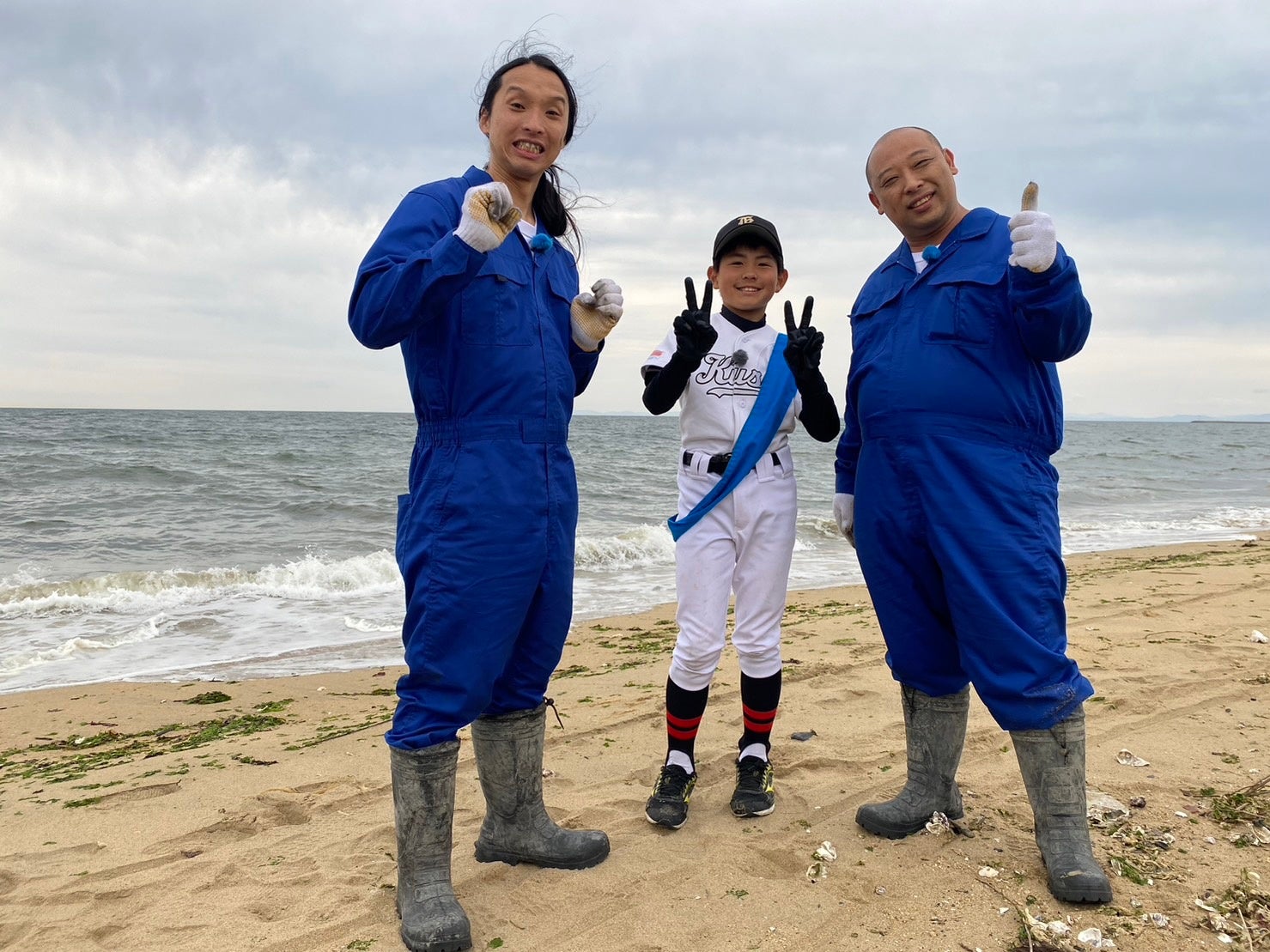 こちらでも地元の子どもと一緒にごみ拾い!「お笑い対決」は、ごみに絡めた大喜利で勝敗を決定!勝者のご褒美は、絶品ハマグリ料理!