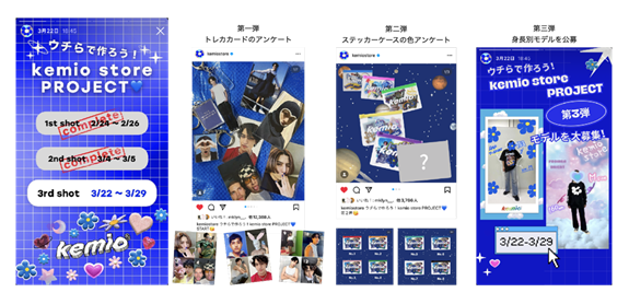 ブランドのSNSを活用し、ファンを巻き込んだキャンペーン企画「ウチらで作ろうkemio store」を実施いたしました。商品企画のアンケートやWEBサイトの身長別モデルの公募をInstagramで行うなど、ファンと共創するブランド作りを実現しています。