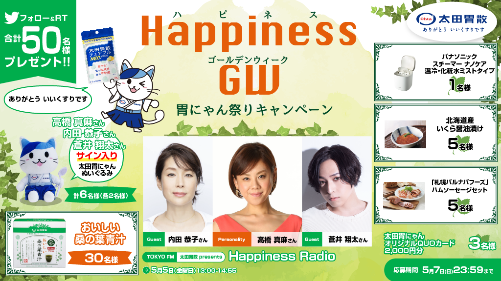 同社のTOKYO FM「太田胃散 presents Happiness Radio」<パーソナリティ:高橋真麻さん>とのコラボ企画となっておりますので、ぜひ番組ともにチェックしてください。