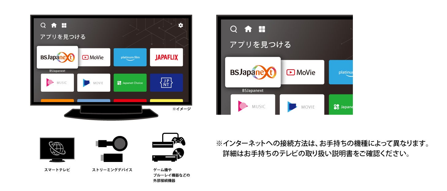 これにより、BS放送の視聴環境がない方でも、BSJapanextの番組を同時視聴できたり、見逃し配信を楽しめたり(一部番組を除く)と、お手持ちのスマートテレビやストリーミングデバイス、ブルーレイプレイヤーやゲーム機などを使用して、無料でお楽しみいただけるようになります。
