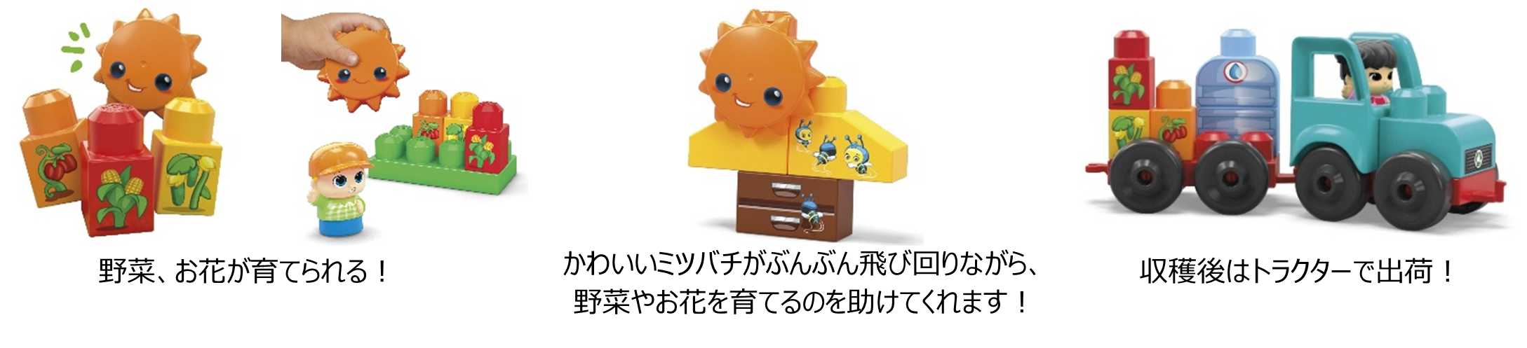 トラクターとキャラクターを含めた全51ピースで、野菜や、ニワトリを育てたり、雨をためて作物に水をあげたり、サステナブルなエコファーム体験ができるブロックセットです。収穫した野菜はトラクターに乗せて出荷することができます。作物の品質を保ったり、トラクターの環境負荷を減らすために近くのお友達に届けたりと、お子さまの想像力を鍛えるだけではなく、作物の育成やニワトリのお世話を通して、社交性、情緒、手先の器用さを育むことができる商品となっており、生物の多様性への理解や、他の生き物への尊重などがテーマになっているセットです。
