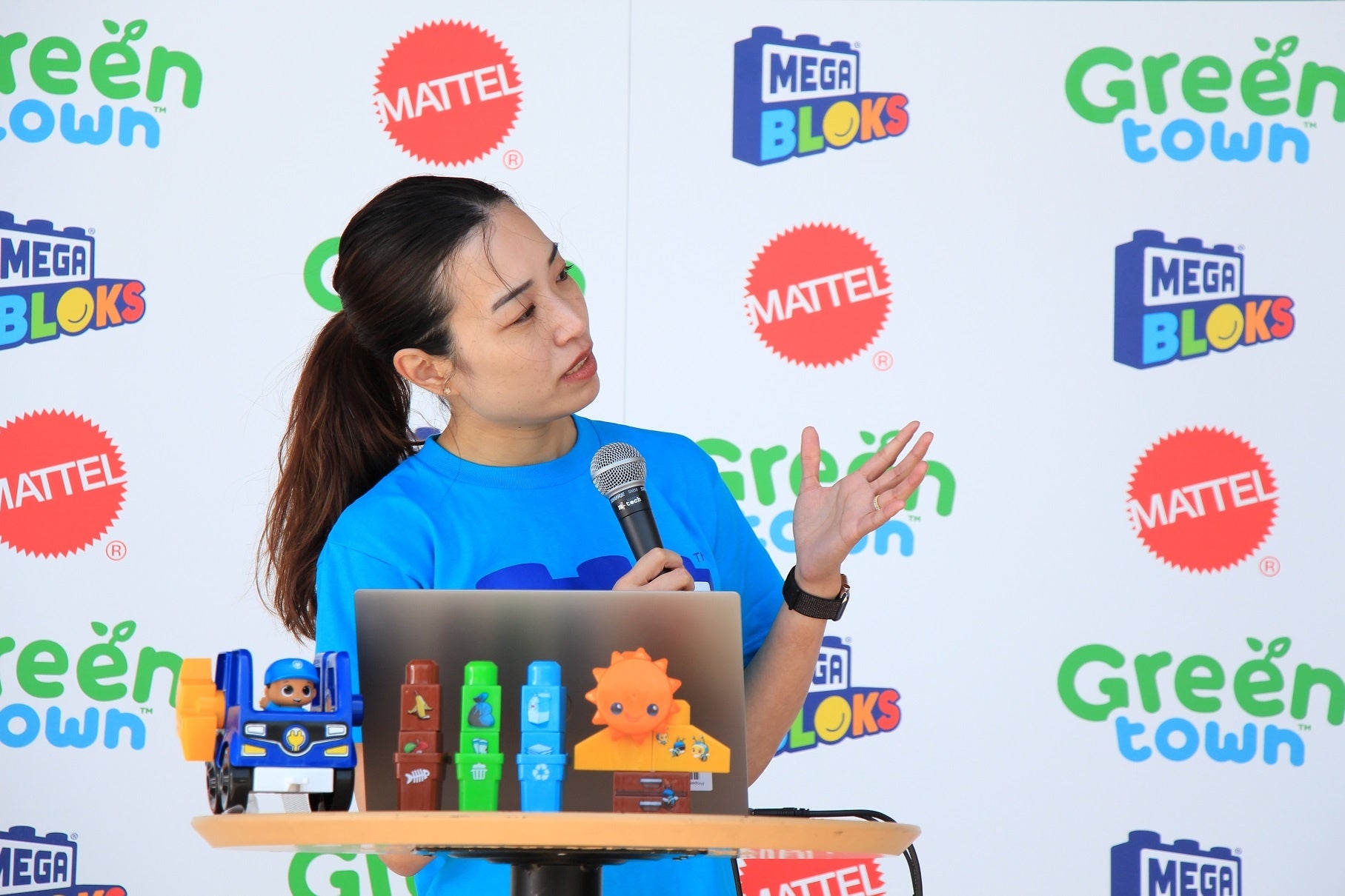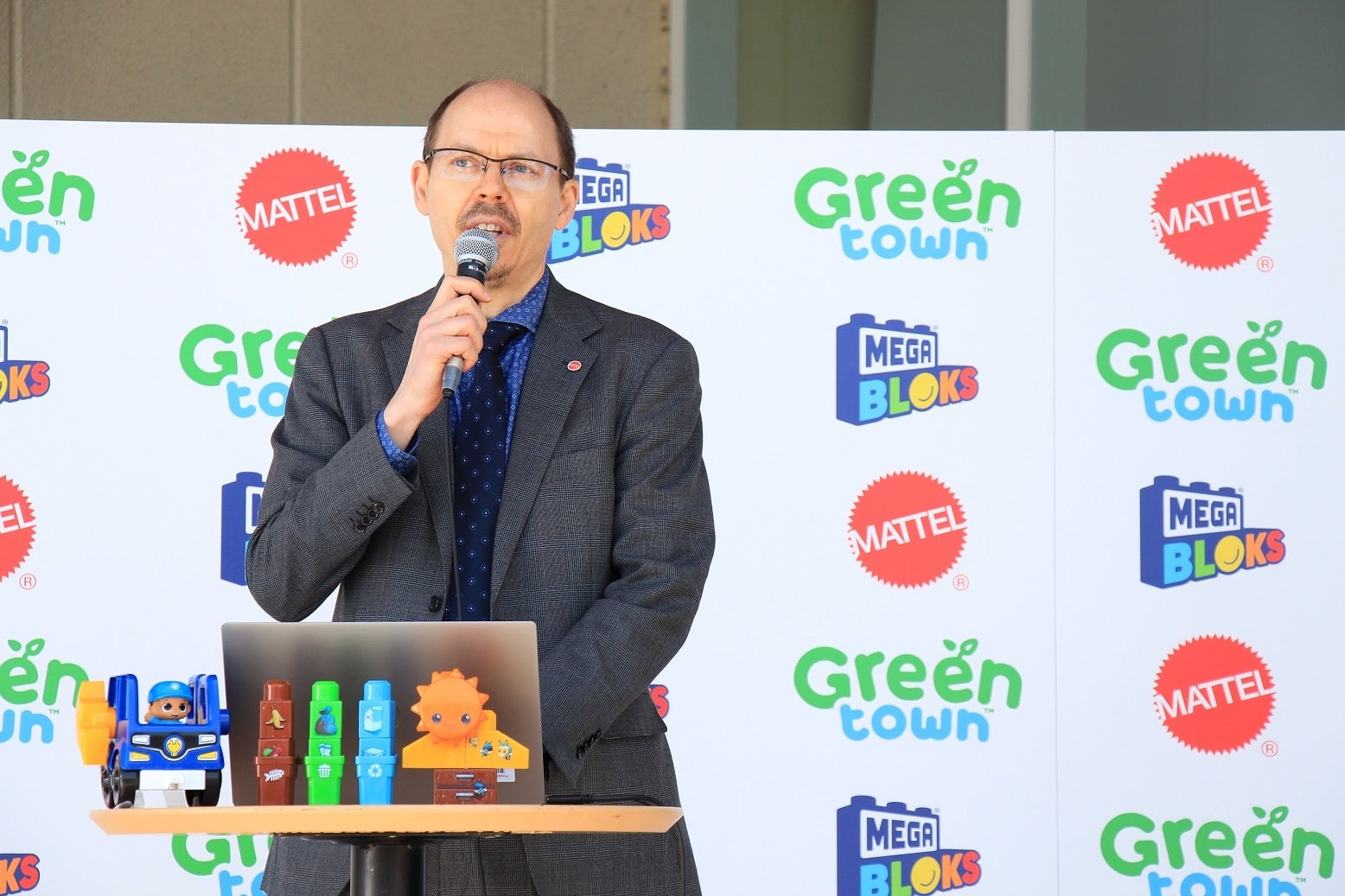最初にマテル・インターナショナル株式会社 マーク・パンサール社長より、「我々、マテル・インターナショナルは次代を担う子供たちに、子供時代の素晴らしい未知の発見、気づきを与え、最大限の可能性を引き出すお手伝いをすること、そしてミッションは遊びを通じて、子供たちにインスピレーションを与え、楽しみ、成長をはぐくむ、イノベイティブな製品と経験を創出することです。マテル・インターナショナルの3つのゴールは①2030年までに、製品およびパッケージにおいて、リサイクル素材や再生可能素材、またはバイオベースプラスチック材料を100%使用する②製品およびパッケージに使用する、紙および木製繊維において、リサイクル素材、またはFSC(Forest Stewardship Council)認証素材の含有率95%を維持する③2030年までに、製品ごとにプラスチック包装を25%削減する(2020年基準)ことです。」と宣言し、「今回の新製品メガブロック グリーンタウンは量販店流通玩具において世界で初めてカーボンニュートラル認証を取得※1した製品で、子供たちが遊びを通して自分たちの未来を想像し、世界は”Ours to Build” – より良い世界はみんなでつくりあげるものであることを教えるように設計されています。」と挨拶されました。