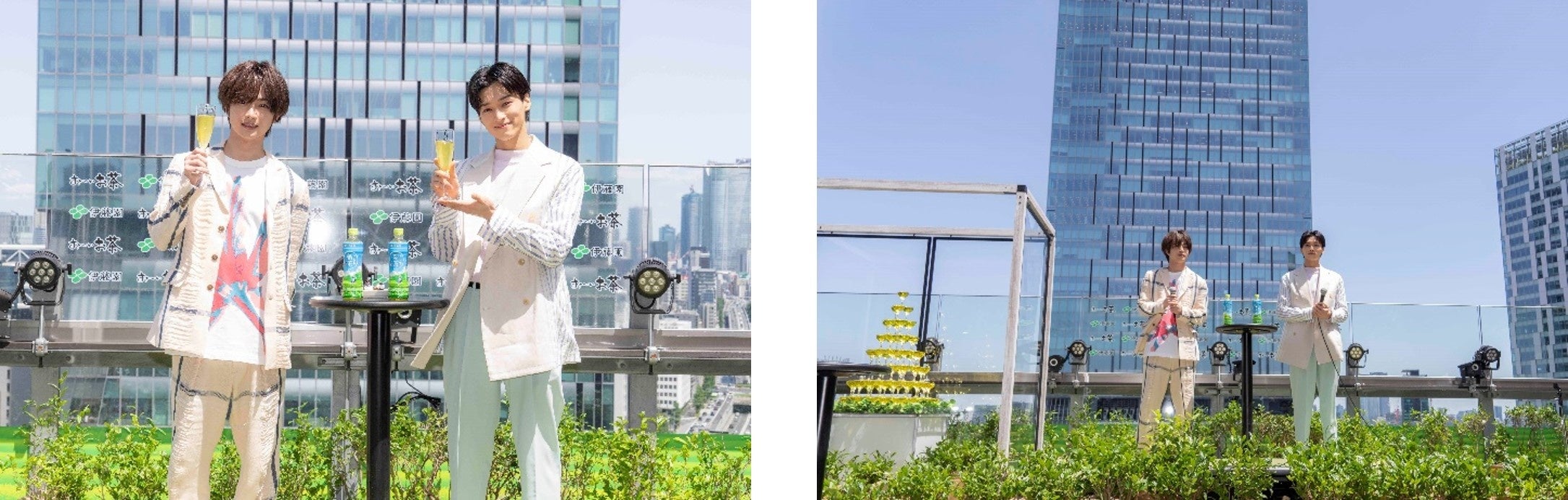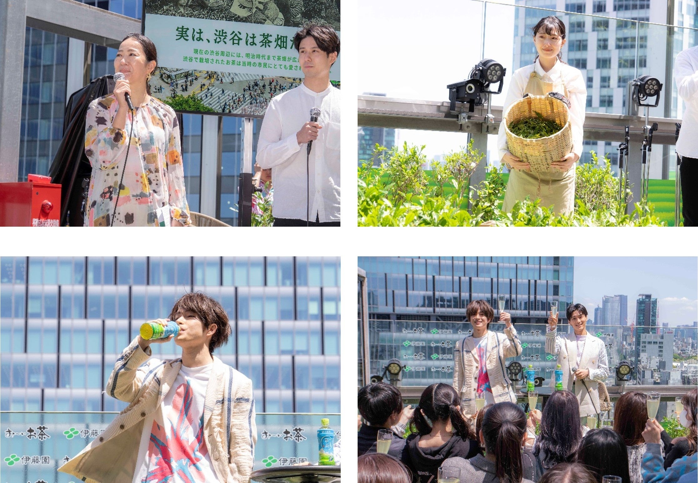 本イベントは、現在の渋谷周辺にはかつて茶畑が広がっていた歴史に加え、若者にもっとお茶の魅力を知っていただきいという想いから、若者の街として賑わう渋谷で企画された体験イベントです。当日は、「お~いお茶 新茶」の新製品および製品開発の経緯について、株式会社伊藤園・緑茶ブランドグループの倉橋悠太よりご紹介。渋谷とお茶の歴史については、一般財団法人渋谷区観光協会 理事 兼 事務局長 小池ひろよ様にご説明いただきました。さらに、特別ゲストとして俳優の曽田陵介さん、松本怜生さんにご登場いただき、お客様とともに伊藤園社員が摘んできた産地直送の新茶で乾杯、トークセッションと新茶を楽しむパーティーを開催しました。