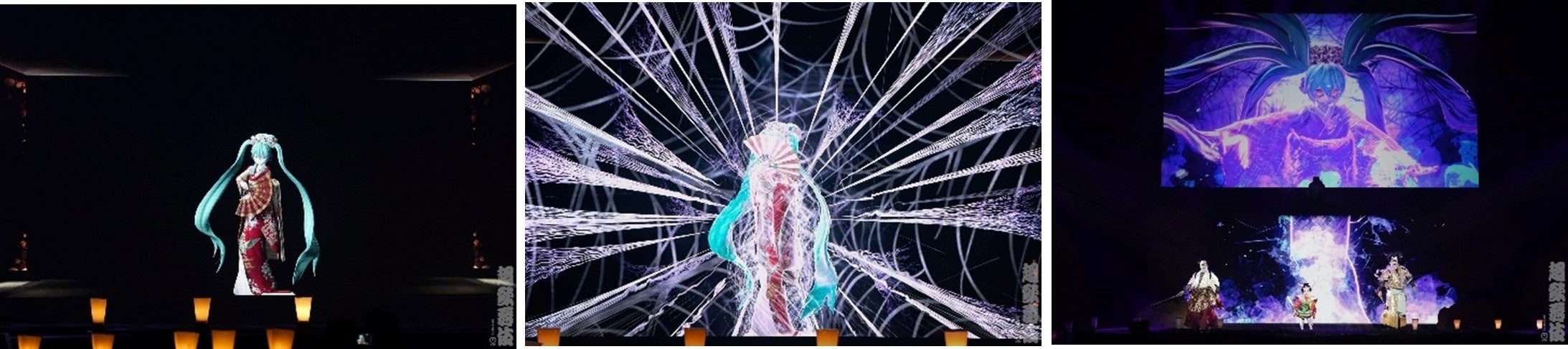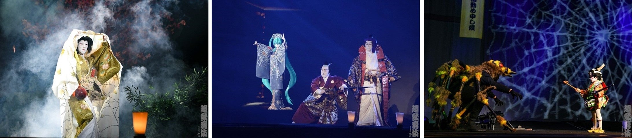初音ミクは全盛を誇る傾城・七綾太夫役を艶やかに、くっきりと演じる。拍子舞、しっとり唄い踊る姿も、指先まで美しい! 獅童演じる保輔が、「お前の心を盗みに参った」と口説くように見せかけて七綾太夫を斬る場面は、驚きの展開。太夫の亡魂と女郎蜘蛛が合体し、発光しながらみるみる隈取が現れ、悪へと変化していく場面は圧巻だ。この初音ミクの闇落ち、悪役は同作の大きな見どころ。バーチャル・シンガー鏡音リン&レンの大薩摩(勇壮な唄と三味線演奏)も物語を大いに盛り上げる。