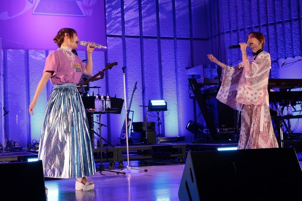 後のMCで「翔子ちゃんが好きって言ってた曲でセトリを作りました。大事な友達で“戦友”という気持ちもある翔子ちゃんのために歌います」と語った彼女は、スペーシーなサウンドに迫力のあるロングトーンを轟かせた「スターゲイズ・ラブ」から「明日のプリズム」「MonStAR」とハッピーなムードのポップロックを立て続けに披露。パワフルかつ伸びやかな歌声を野音ならではのマジックアワーの背景が光るステージに響かせると、テレビアニメ『涼宮ハルヒの憂鬱』のオープニングテーマとして大ヒットした「冒険でしょでしょ?」に続き、同作の劇中曲で中川も2010年のカバーアルバム「しょこたん☆かばー3 〜アニソンは人類をつなぐ〜」でカバーしている「God knows…」で2人のコラボレーションが実現。「あやちゃんかわいい、大好き。今日のこの時間を一生忘れません」と興奮気味の様子でステージに上がった中川は、平野の隣で歌いながら溢れる思いが止まらずオタ芸を繰り出していた。そして<重なるよいま 二人にGod bless…>というフレーズでばしっと目を合わせて声を重ねると、場内は大きな歓声に包まれた。