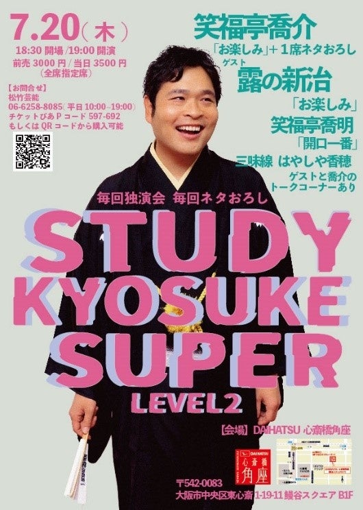 そのメンバーで令和2年度文化庁芸術祭大衆芸能部門新人賞など数々受賞歴のある笑福亭喬介が2022年に2か月に1回(計5回)松竹芸能のホームグラウンドDAIHATSU 心斎橋角座にて公演した落語会「スタディ喬介超(スーパー)」の開催が決定いたしました。