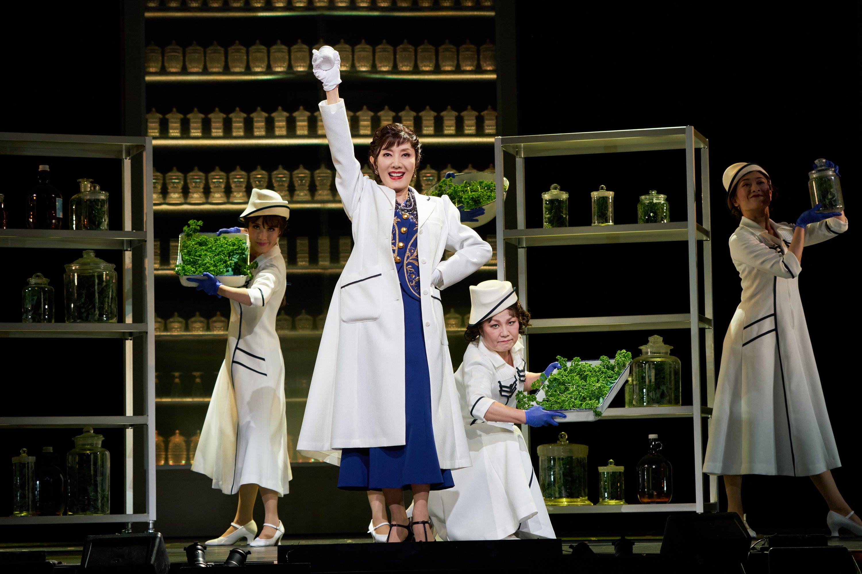明日海演じるエリザベスはパッケージのかわいらしさを重視、戸田演じるヘレナは科学的成分を重視。正反対の方法で美にアプローチし、対立感情をあらわにする二人は、衣裳の色合いも対照的。だがその人生を交互に見るうちに、むしろ時代のパイオニアとして重なる点が多いことに気付かされていく。あくなき美への探究心。困難をアイディアで乗り越えるパワー。そして、どんなに成功しても、女性として、移民として、アウトサイダーの扱いを受け続ける哀しみ……。