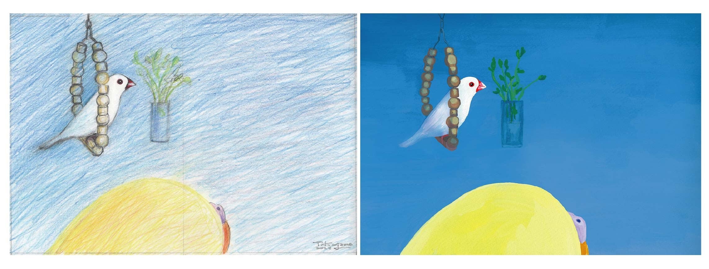 また、「ARUKU COFFEE & GALLERY」にて『きいろとしろ』の著者直筆原画を2023年5月23日(火)から 7月15日(土) の期間に展示。全原画に加え下書きも展示、『きいろとしろ』の魅力を存分に堪能できる展示となっています。