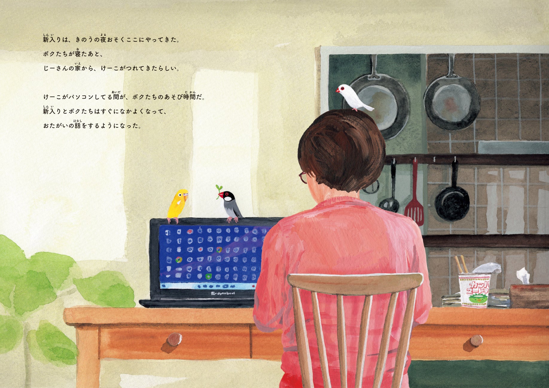日本各地で大きな反響を生んだ絵本『じーさんとぴーぽっぽ』の第二作目。普段は気がつかない人生を誰かと一緒に歩く幸せに気づかせてくれる一作目に続き、鳥たちの気持ちを届けていく作品。主人公のセキセイインコ「きいろ」の目線で、鳥たちが生きる世界の楽しさ、人の家で暮らす白文鳥「しろ」と桜文鳥「ぴーぽっぽ」との出会いと別れが描かれています。
