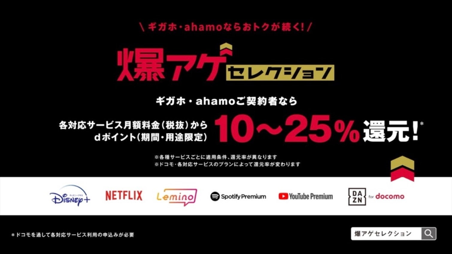 2023年4月1 日(土)から提供を開始した、ギガホ・ahamoご契約者なら人気サービスのご利用で毎月最大25%のdポイントを還元する特典「爆アゲ セレクション」