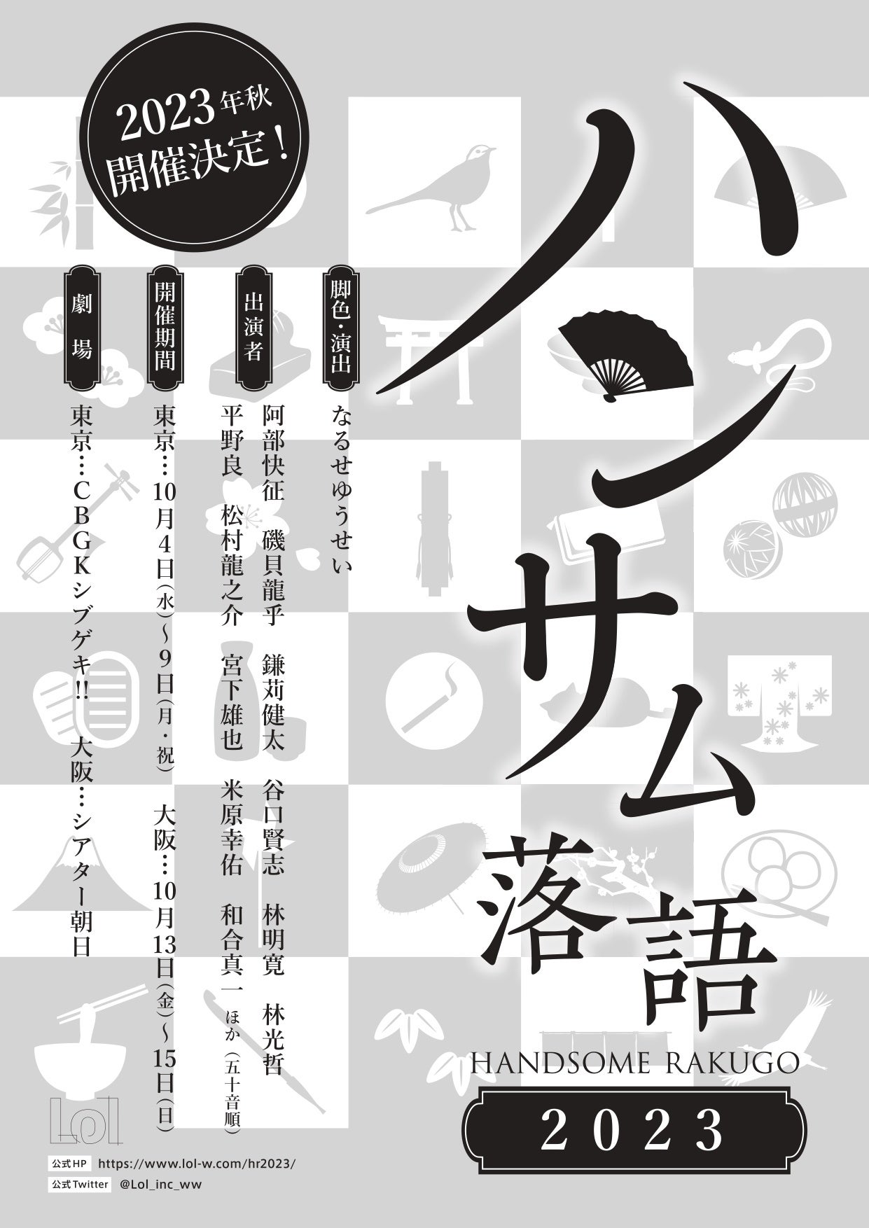 皆様に支えられ、10年目を迎えた人気シリーズのハンサム落語。約2年ぶりとなる舞台公演が満を持して決定!久しぶりに大阪も行きます!出演は本作を牽引してきた磯貝龍乎、林明寛、平野良、宮下雄也、米原幸佑に加え、阿部快征、鎌苅健太、谷口賢志、林光哲、松村龍之介、和合真一の出演が決定致しました!