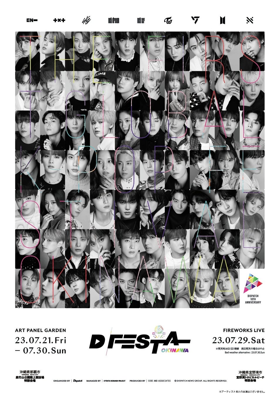 韓国芸能ニュースメディア”Dispatch(ディスパッチ)”の創立10周年を記念し、世界で活躍する9つのK-POPグループ=計69名(ENHYPEN、TXT、STRAY KIDS、NCT DREAM、NCT 127、TWICE、SEVENTEEN、BTS、NU’EST) のオリジナルコンテンツが集結した奇跡のK-POPフェス「D’FESTA」。日本での開催は昨年の東京の2カ所、大阪に続き4カ所目となる「沖縄」の地で、2023年7月21日(金)から7月30日(日)までの期間、K-POPフェス「D’FESTA 展覧会・花火ライブin沖縄」と題して開催することが決定しました。