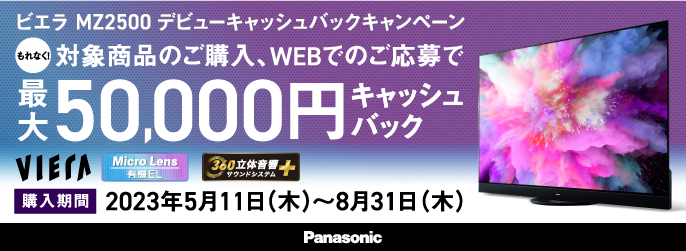 期間中に4K有機ELビエラ MZ2500シリーズをご購入いただき、WEBからご応募で最大5万円をもれなくキャッシュバックいたします。