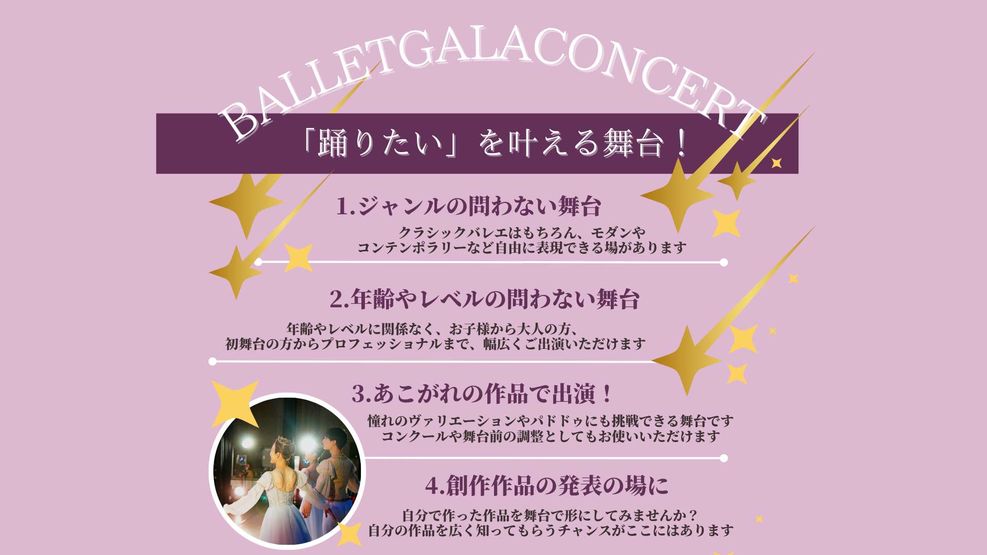 バレエガラコンサートは、関東・関西エリアを中心に開催しており、みんなの「踊りたい!」気持ちを叶える舞台です。