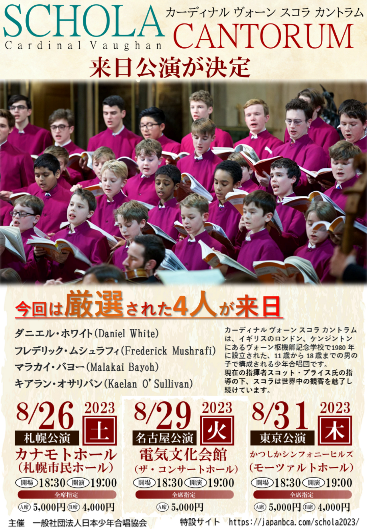 イギリスの名門少年合唱団「カーディナル ヴォーン スコラ カントラム」が、日本公演を行います。イギリスのロンドン、ケンジントンにあるヴォーン枢機卿記念学校(カーディナル ヴォーン メモリアル スクール)の1980 年に設立された、11歳から 18歳までの男の子で構成される典礼合唱団です。イギリス国内のみならず、世界的にも高い評価を受けています。