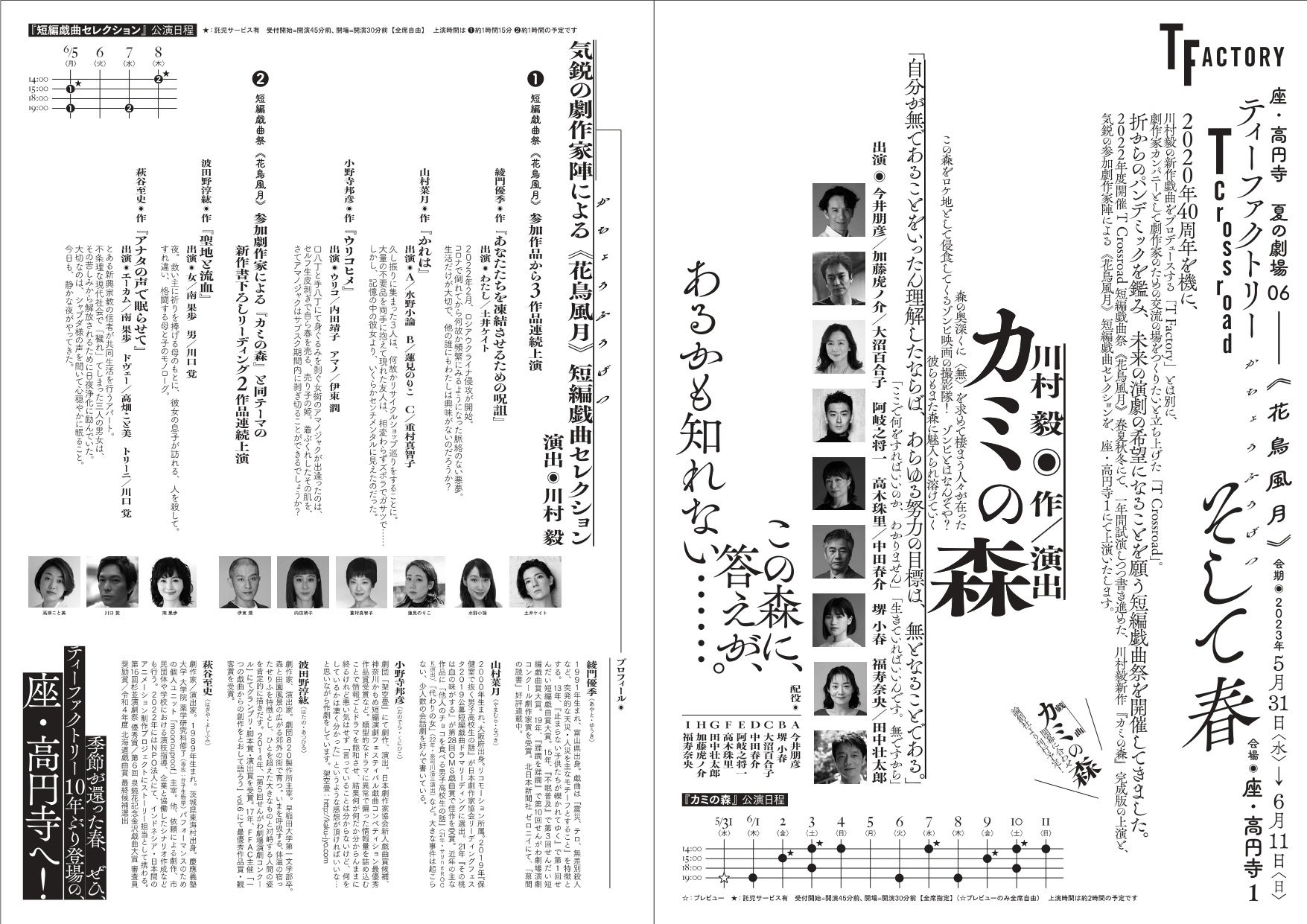 「そして春」2022年度開催T Crossroad短編戯曲祭<花鳥風月>春夏秋冬にて、一年間試演しつつ書き進めた、川村毅新作『カミの森』完成版の上演と、気鋭の参加劇作家陣による<花鳥風月>短編戯曲セレクションを、座・高円寺1にて上演いたします。