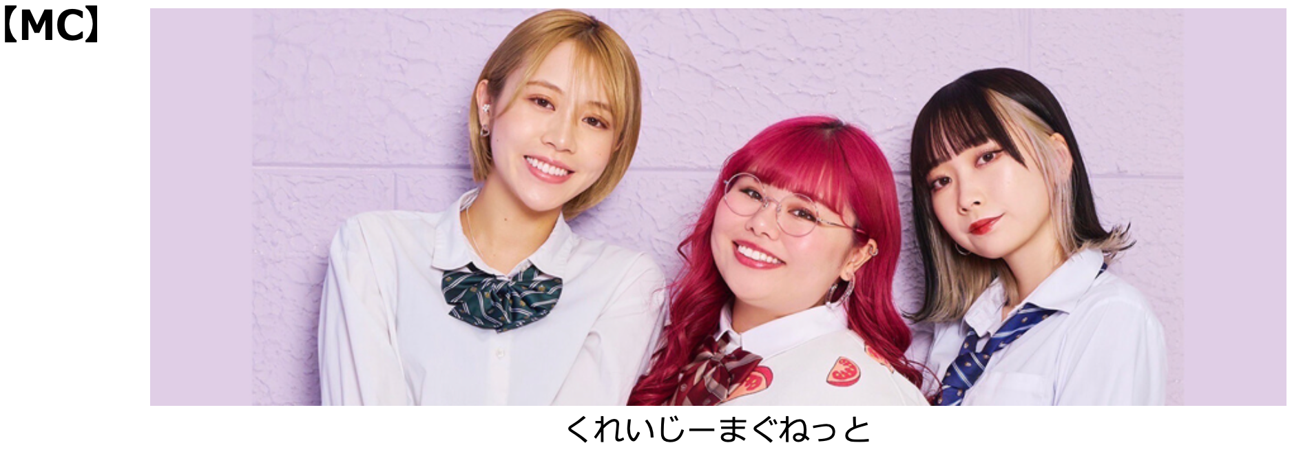 MCは、SNS総フォロワー数は驚異の900万人超え、チャンネルの動画総再生回数は7億回を超えるなど、Z世代の女性を中心に絶大な人気を集めている個性派揃いの#期限切れJK 3人組女性クリエイターユニットで、『TGC teen ICHINOSEKI 2023』でもMCを務めるくれいじーまぐねっとに決定!