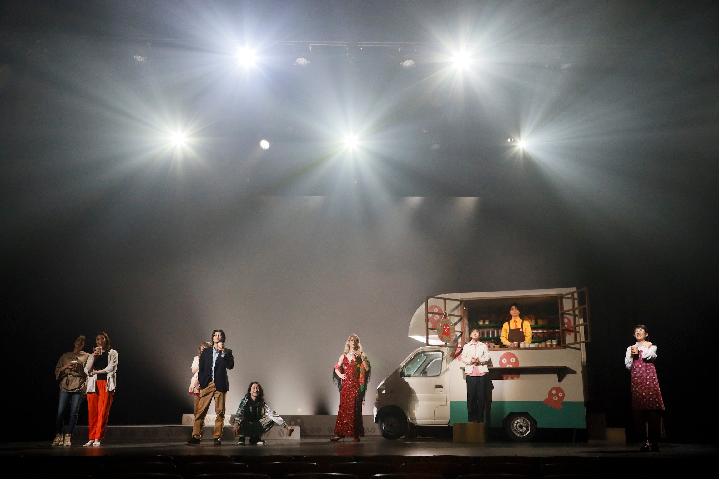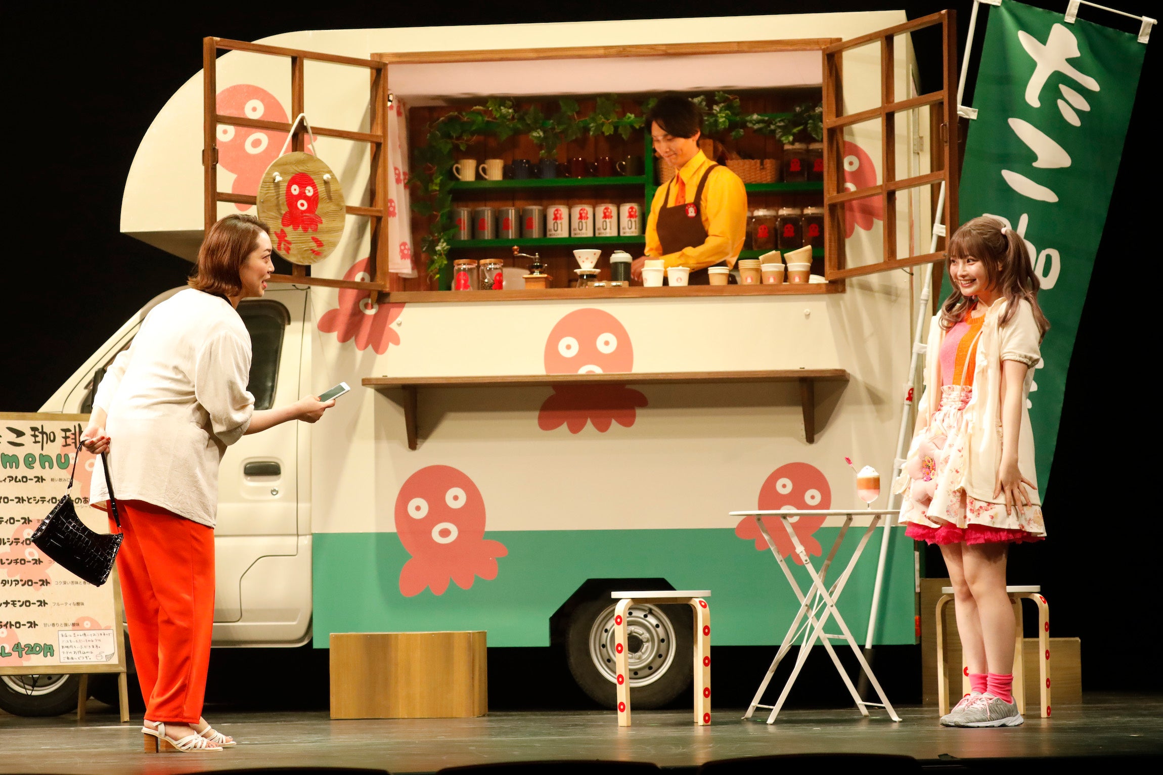 ステージ上で目を引くのは、本物の軽トラを改造したキッチンカーのセット。囲みでも出た通り、豆を挽く音やお湯を注ぐ音、丁寧に珈琲を淹れる手順や漂ってくる香りなどを五感で楽しみ、心地よい空気に癒されることができる。物語を通して意外と知らない珈琲の知識を学べるのも楽しい。