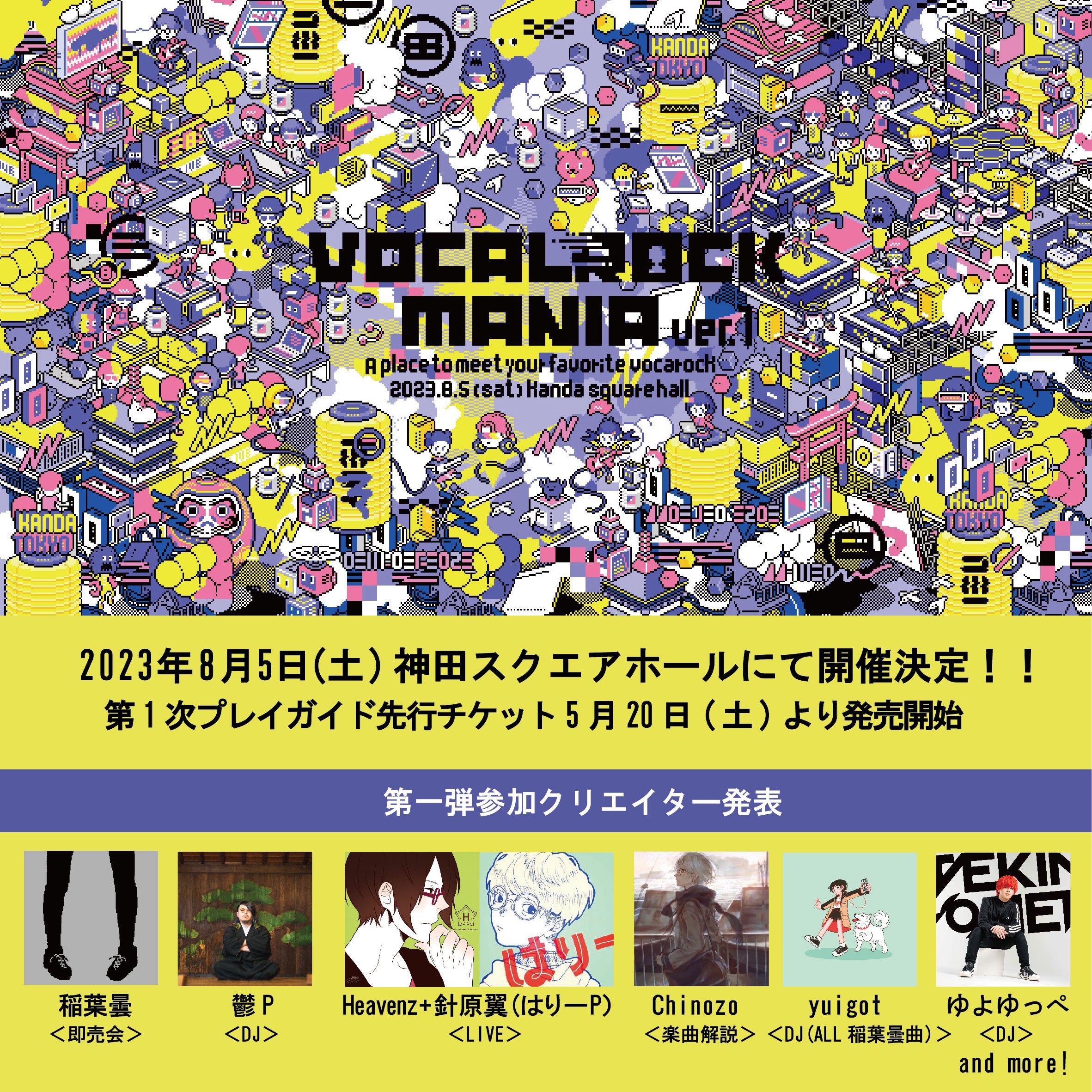 「グッバイ宣言」がYouTubeで1億回再生を突破し大ヒット中の”Chinozo”は楽曲解説と即売会で参加。「ぼくらのレットイットビー」「泥中に咲く」などのボカロ曲を投稿しながら、音楽ユニット『空白ごっこ』のコンポーザーとしても活動している”針原翼(はりーP)”とアプリゲーム「プロジェクトセカイ カラフルステージ!feat.初音ミク」に「フロート・プランナー」が収録され注目を集める”Heavenz”は2人でライブパフォーマンスで初参加。ボカロ曲を投稿しつつ「稲葉曇/ロストアンブレラRemix」が280万再生と数々のリミックスワークに定評のある”yuigot”はMVを使用した全曲稲葉曇曲のDJで初参加。「Leia」など殿堂入りを果たしたボカロ楽曲を多数作りつつBABYMETALや西川貴教への楽曲提供や、DJ名義” DJ’TEKINA//SOMETHING a.k.a ゆよゆっぺ”として数々のイベントでフロアを揺らしてきた”ゆよゆっぺ”は前作に続きDJと即売会での参加となる。