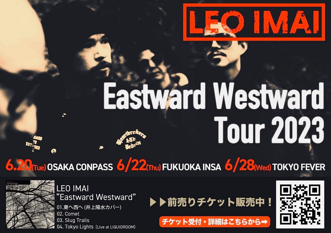 10年以上レコーディングやライブで活動を共にする自身が率いるバンドLEO IMAI [LEO今井 岡村夏彦 シゲクニ 白根賢一]で制作されたHonda ZR-V e:HEV CMソング「東へ西へ」(井上陽水カバー)収録の最新EP「Eastward Westward」が好調配信中のLEO今井。