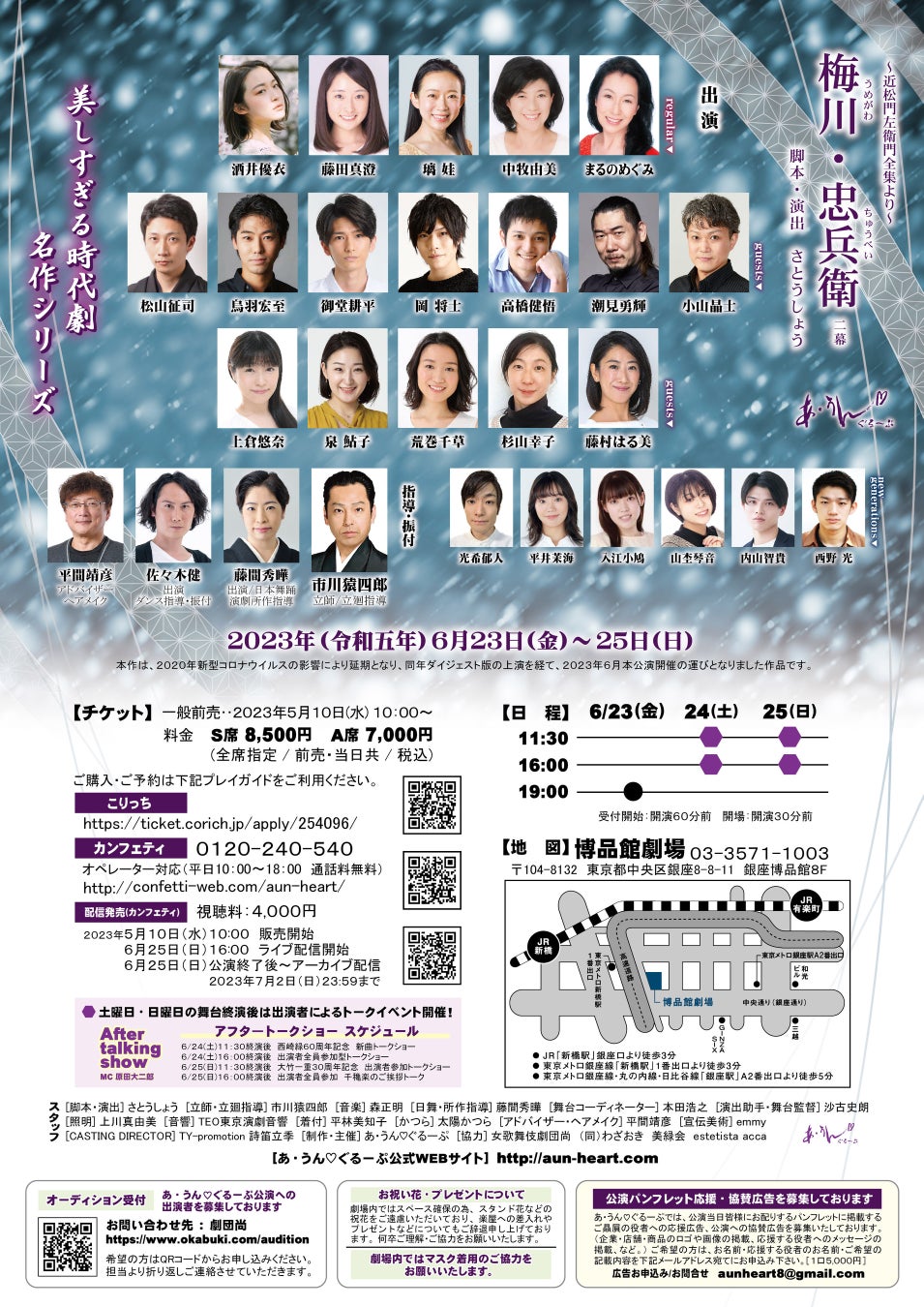 あ・うん♡(ハート)ぐるーぷ制作・主催、『~近松門左衛門全集より~梅川・忠兵衛』が2023年6月23日 (金) ~2023年6月25日 (日)に博品館劇場(東京都中央区銀座8-8-11)にて上演されます。