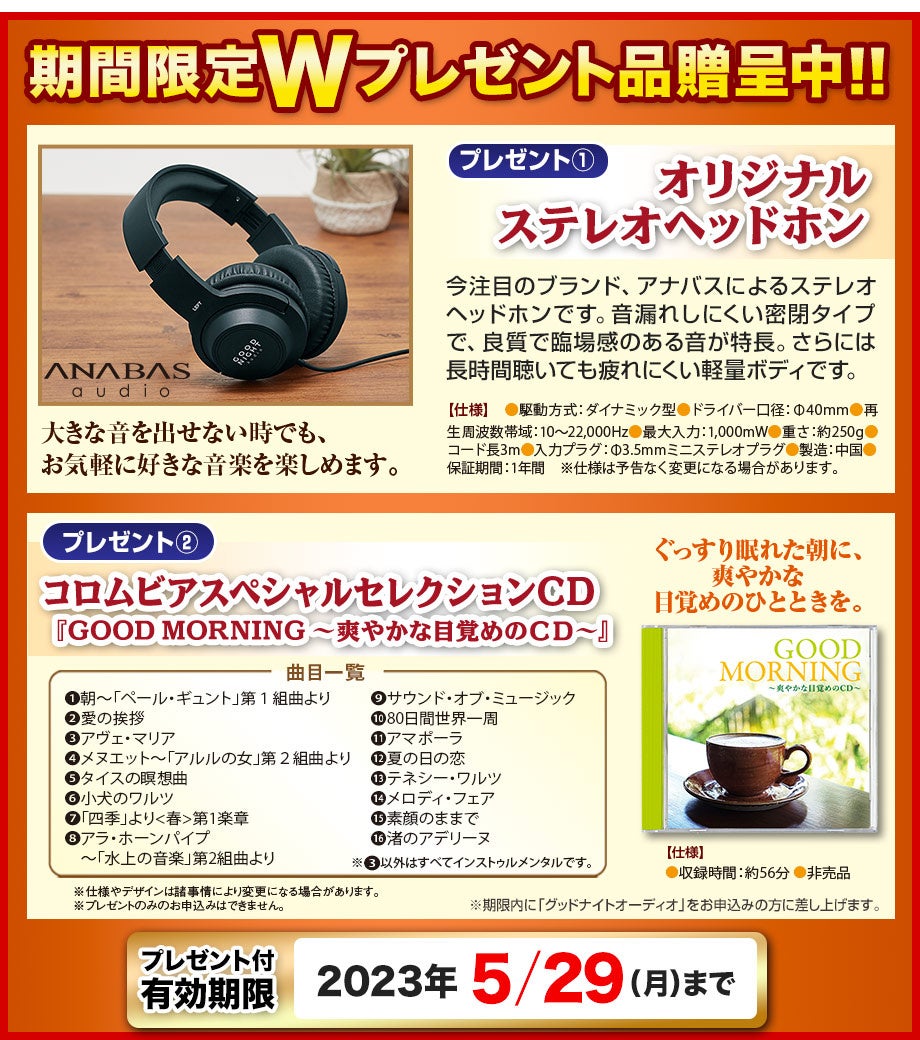5月29日(月)までのキャンペーン期間中にご購入の方には、期間限定Wプレゼントとして「オリジナルステレオヘッドホン」とコロムビアスペシャルセレクションCD「GOOD MORNING~爽やかな目覚めのCD~」を贈呈いたします。