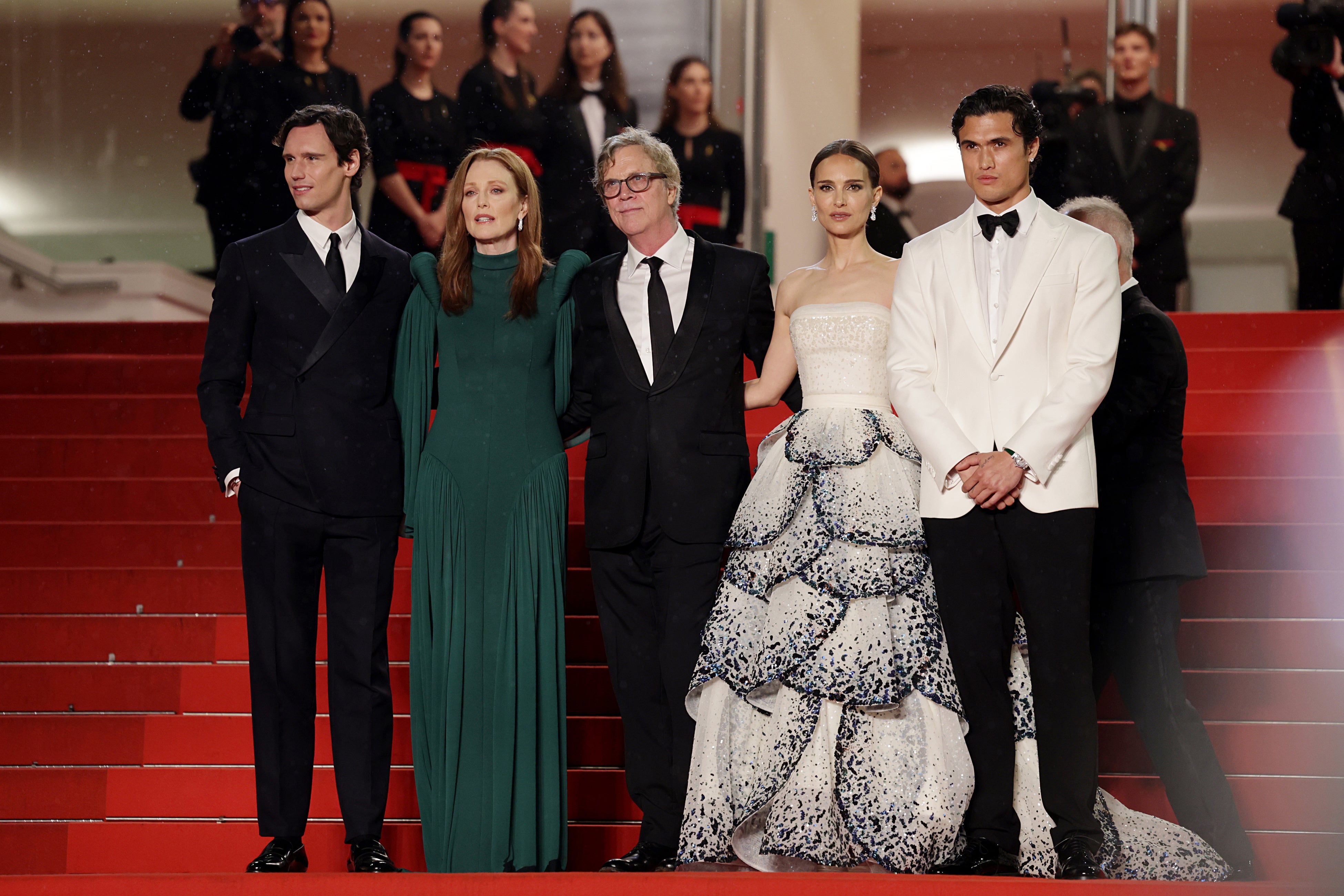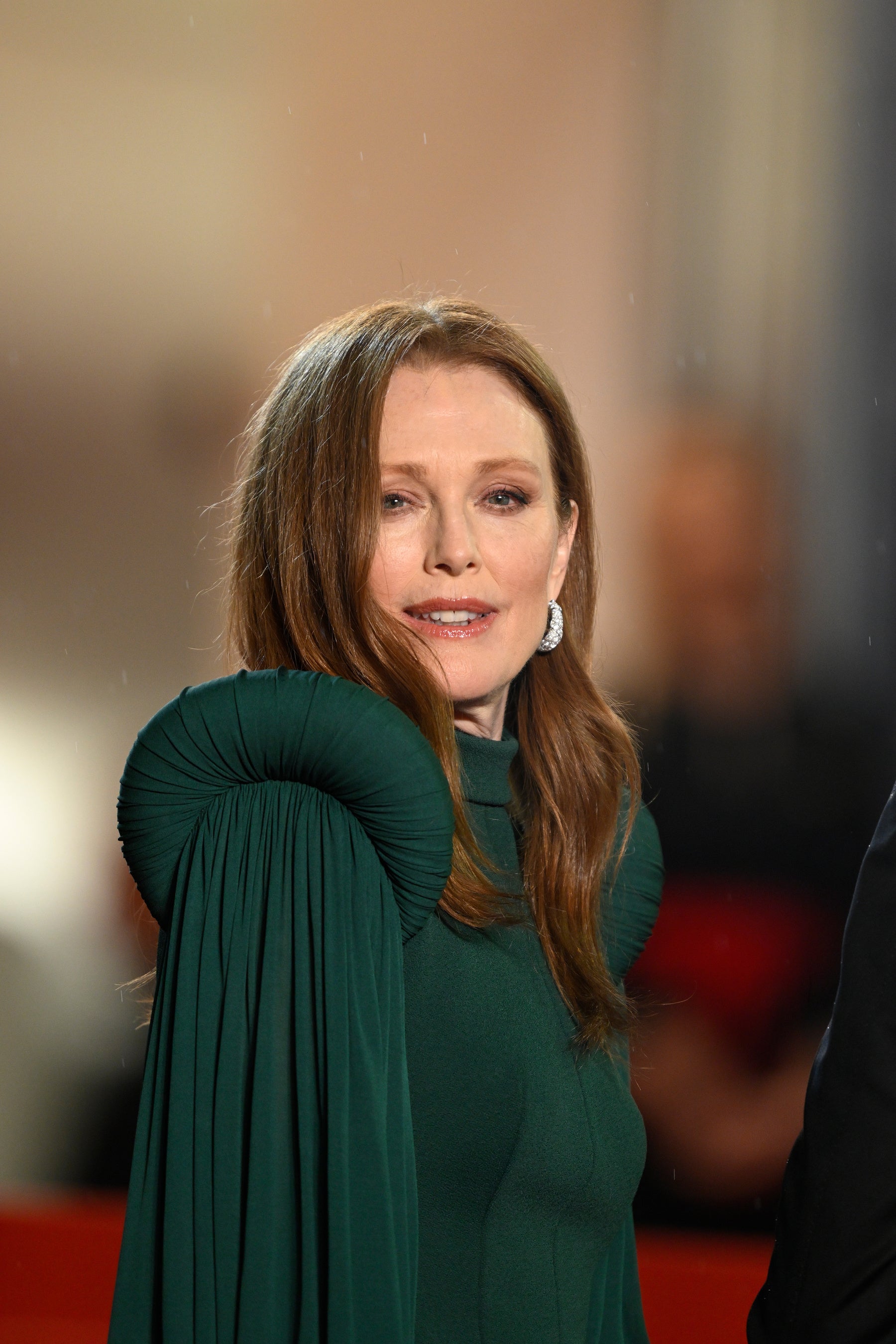 『May December』のプレミアに、カスタムメイドのグリーンのクレープジャージーロングガウンを着用。また、ルイ·ヴィトンのハイジュエリー コレクションより、ホワイトゴールドにダイヤモンドをあしらったイヤリングと、ホワイトゴールドにツァボライトをあしらったリングも着用しています