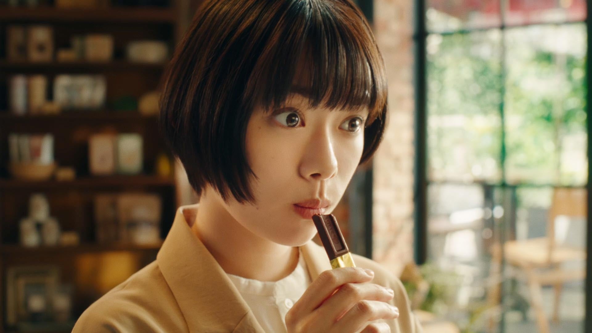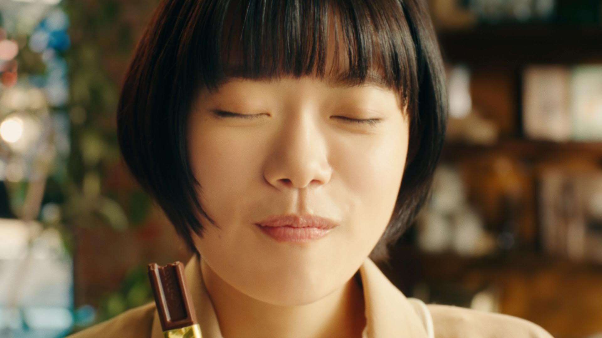 チョコレートがたっぷりかかったスイーツを、扉の影から「美味しそう…」と食べたそうに見つめるシーンから撮影がスタートしました。1テイク目から自然な表情で、甘いものを食べたい気持ちと我慢する気持ちとの心の葛藤を見事に表現。チョコレートの美味しさを様々な表情で伝えるため、演技についても監督と綿密に話し合いながら撮影を続ける杉咲さん。砂糖・糖類ゼロ※ の「ZERO」チョコレートを食べるシーンでは、監督をはじめスタッフ一同がウットリと惹きこまれてしまう程の表情を見せてくれました。カットがかかり、監督の満足そうな様子に杉咲さんも思わず笑顔に。その後も順調に撮影が進んでいき、「ZERO」チョコレートの魅力が満載の新TVCMに仕上がりました。
