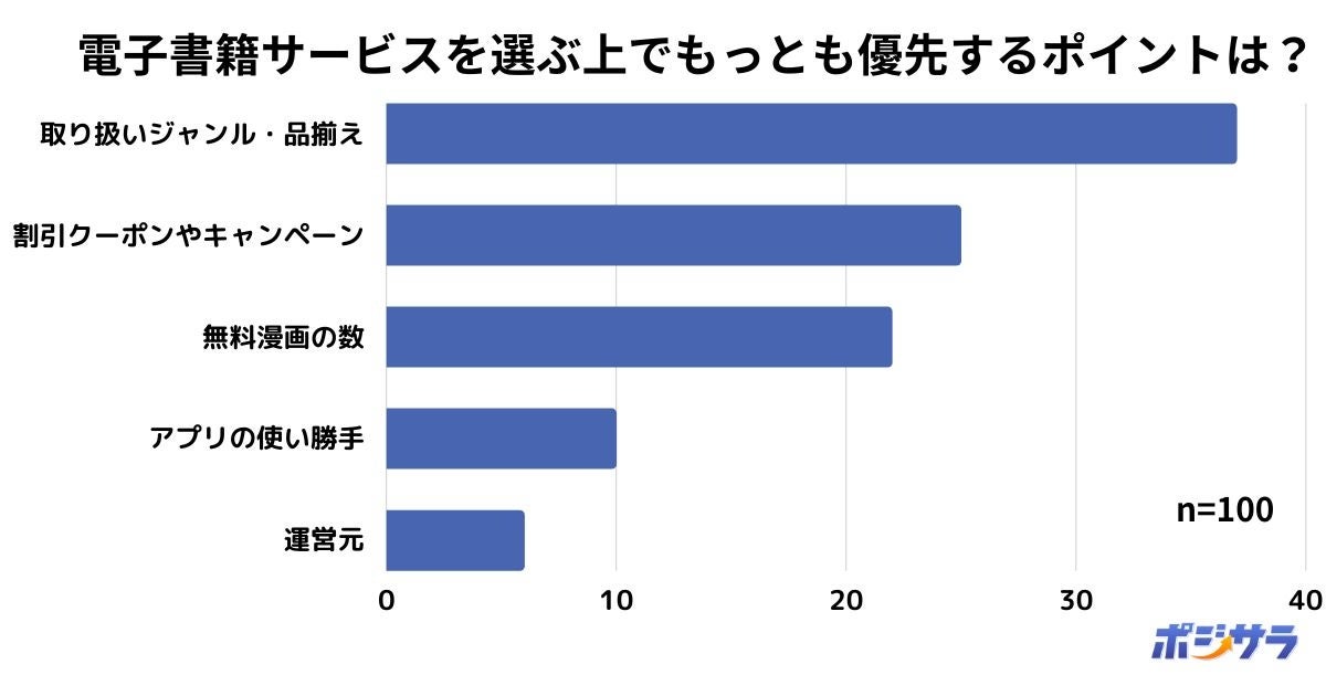 「電子書籍サービスを選ぶ上でもっとも優先するポイントは?」をテーマとしたアンケート調査の結果、1位は取扱いジャンル・品揃えでした。