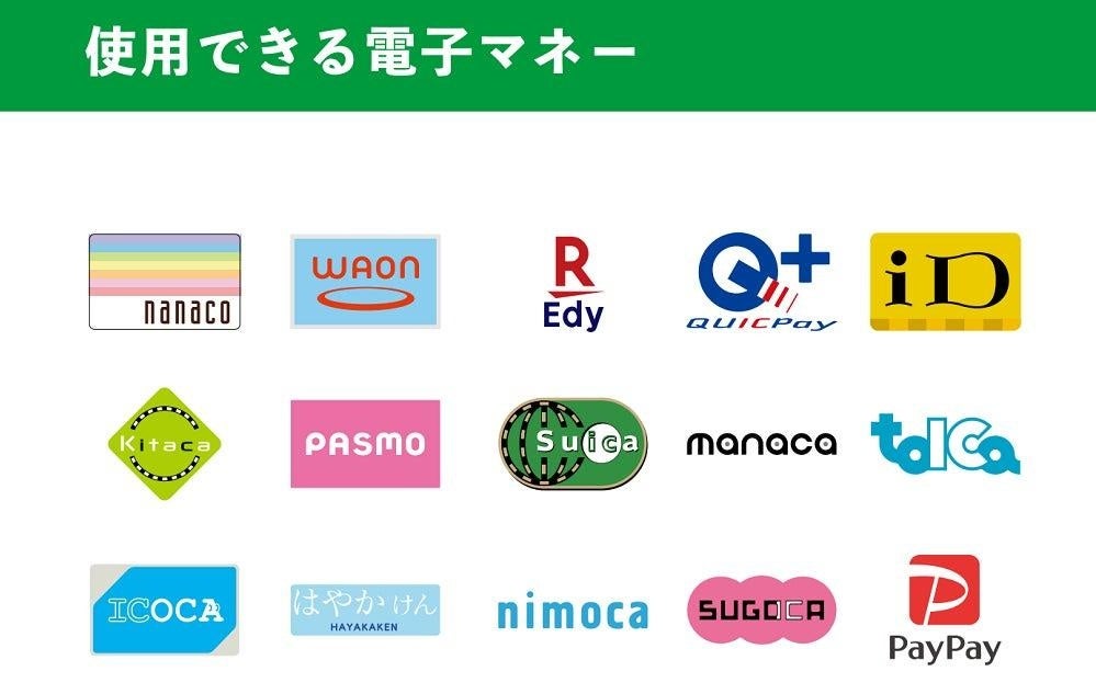 iD / QUICPay / nanaco / 楽天Edy / WAON / Kitaca / PASMO / Suica / manaca / TOICA / ICOCA / はやかけん / nimoca / SUGOCA