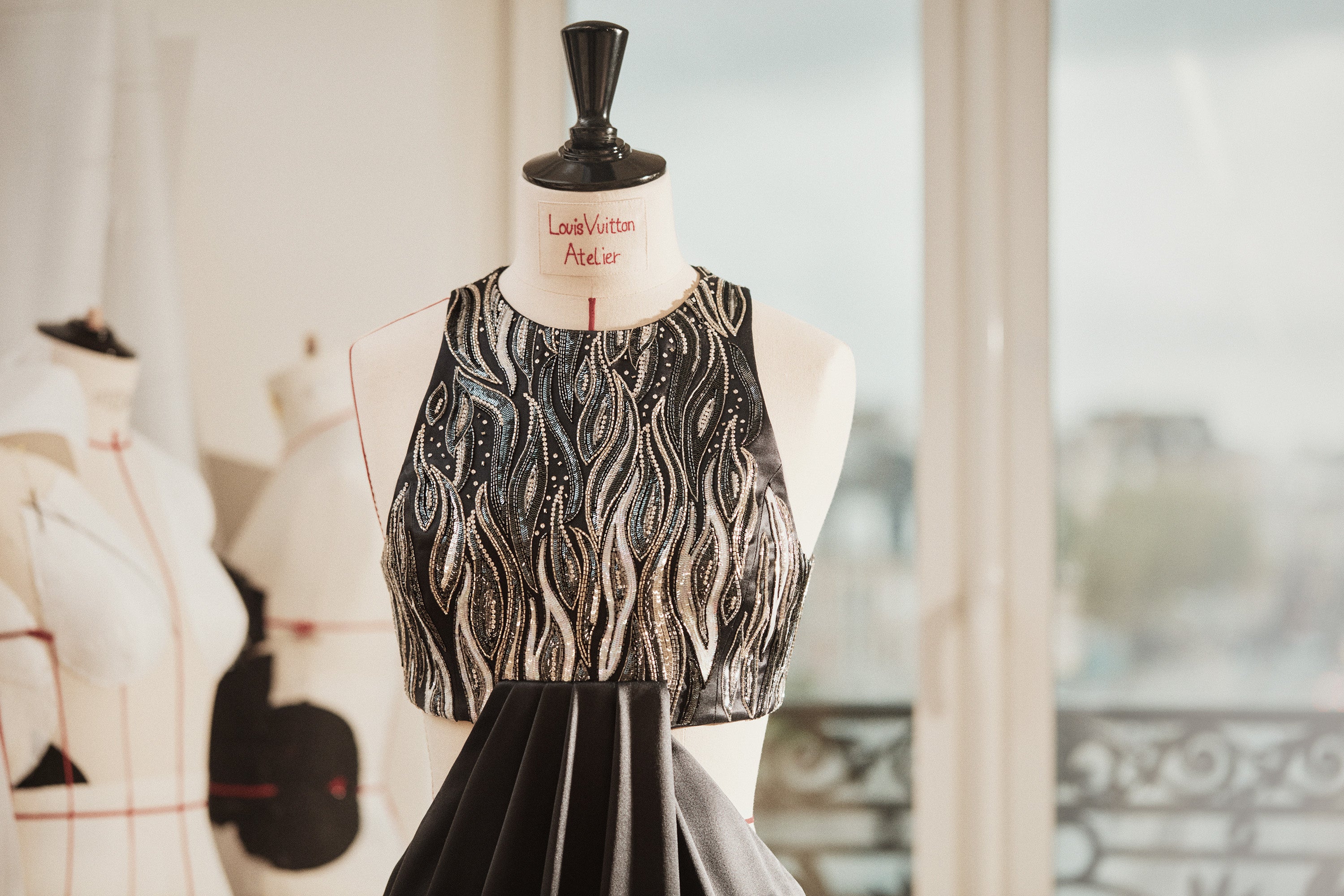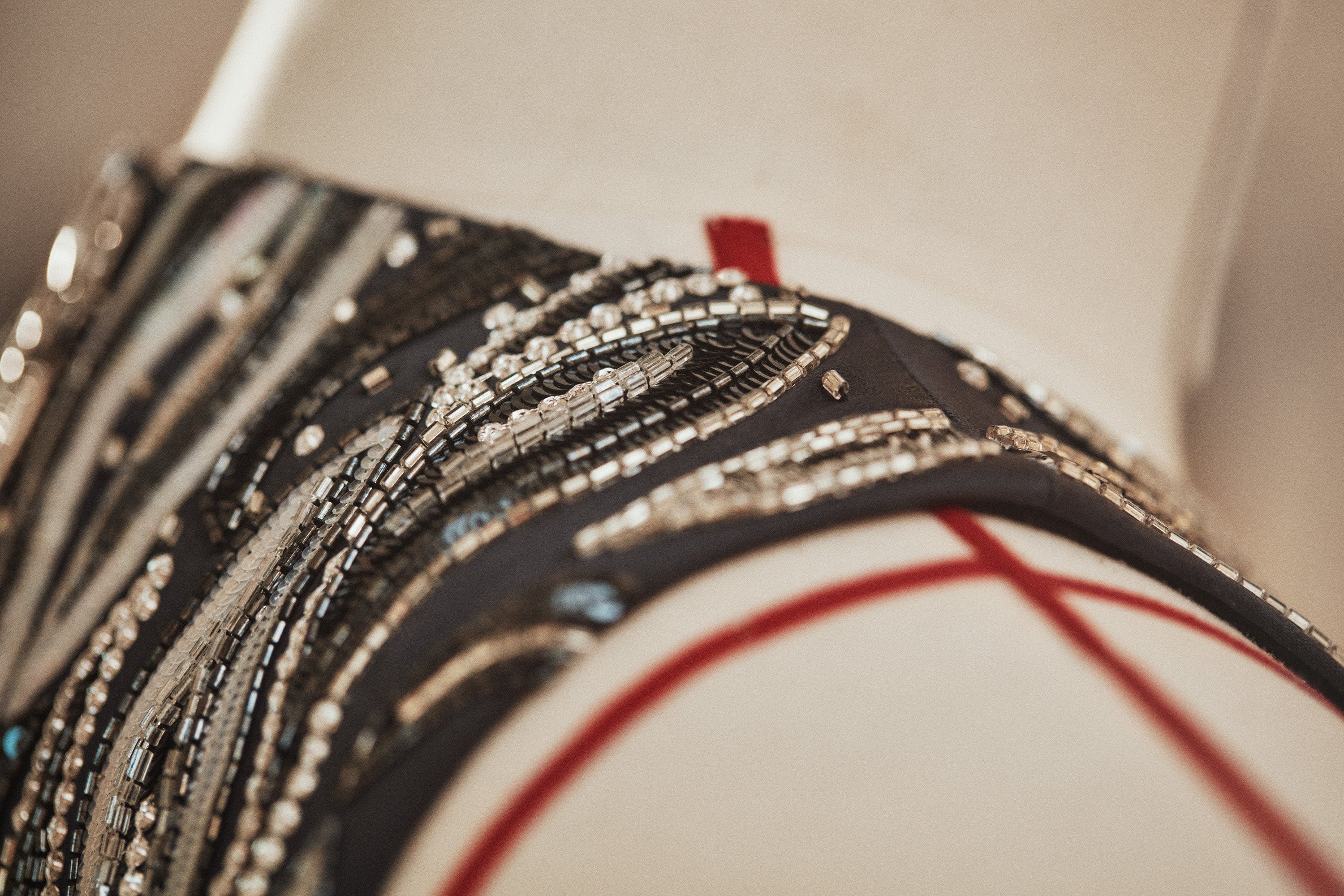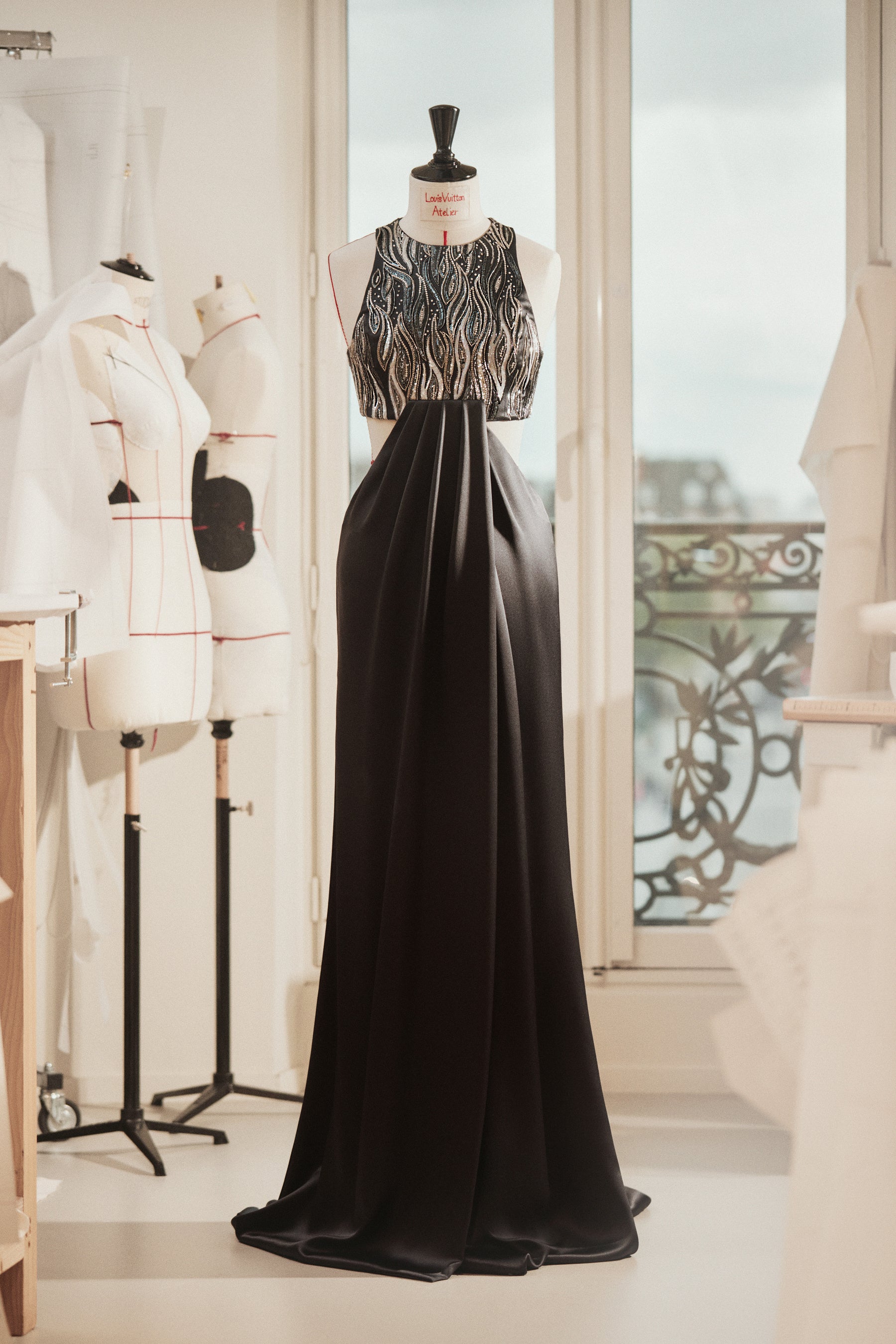 シルクのロングドレスは、前にプリーツがあり、後ろに長いトレーンをデザインしたラップアラウンドスカート、トップにグレーやシルバー、ゴールドのさまざまな色合いのスパンコールと小さなビーズで葉の模様を全面に刺繍し、約280時間をかけて制作されました。