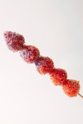 カラフルなザラメの食感が楽しい、練乳がたっぷりかかったイチゴアメ。
