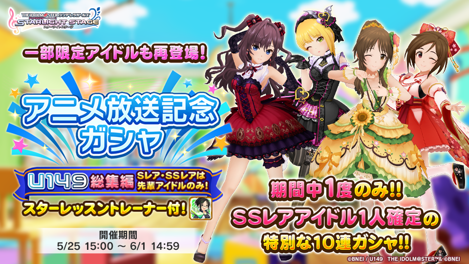5月25日(木)15:00よりデレステにて、TVアニメ「U149」連動キャンペーン第7.5弾としてアニメ「U149」総集編の放送記念SSレア確定ガシャを開催!