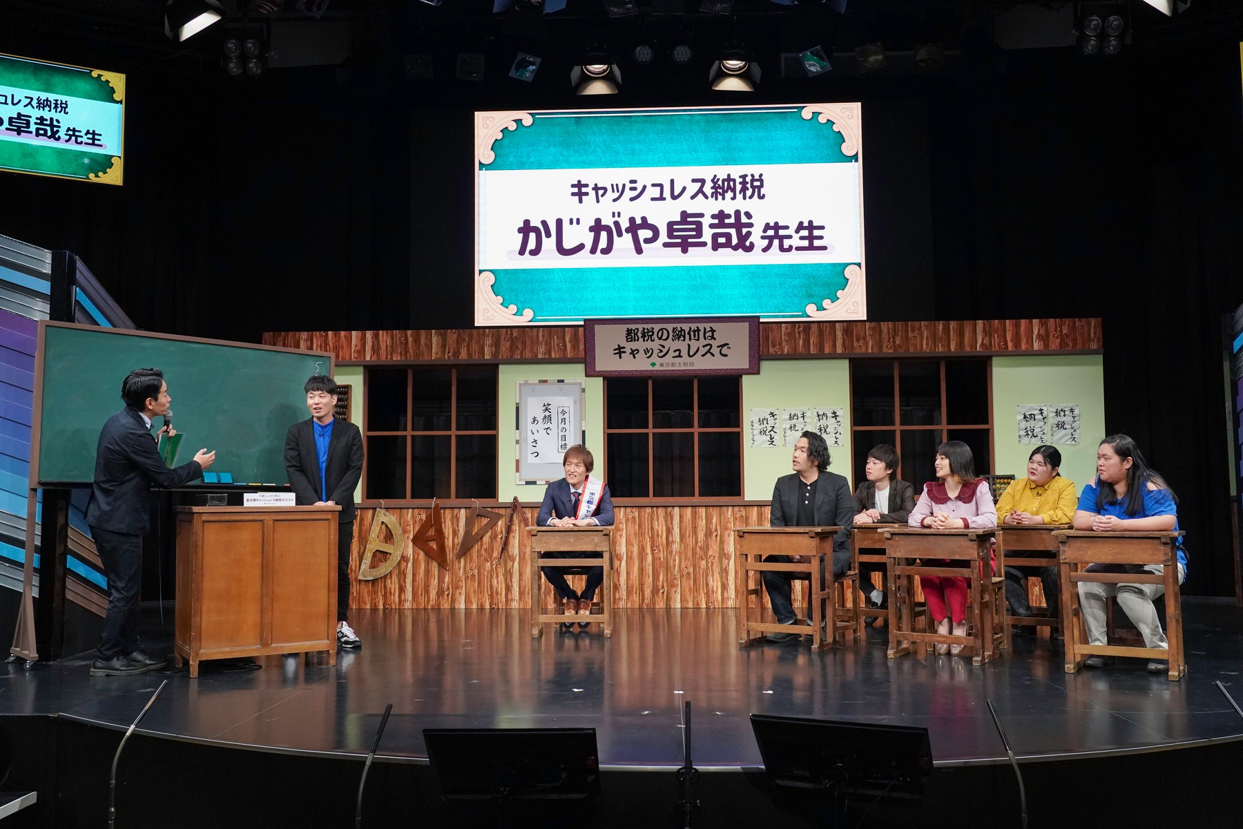 iPhone芸人、家電芸人としても知られるかじがや卓哉が先生として登場。NSC(吉本興業の養成所)在学中に税理士試験に合格し、事務所も開業しているという彼が、生徒役のジュニア、見取り図(盛山晋太郎、リリー)、ぼる塾(あんり、きりやはるか、田辺智加)に、今さら聞けない気になる納税のあれこれ、キャッシュレス納税の魅力や利便性についての授業を行いました。