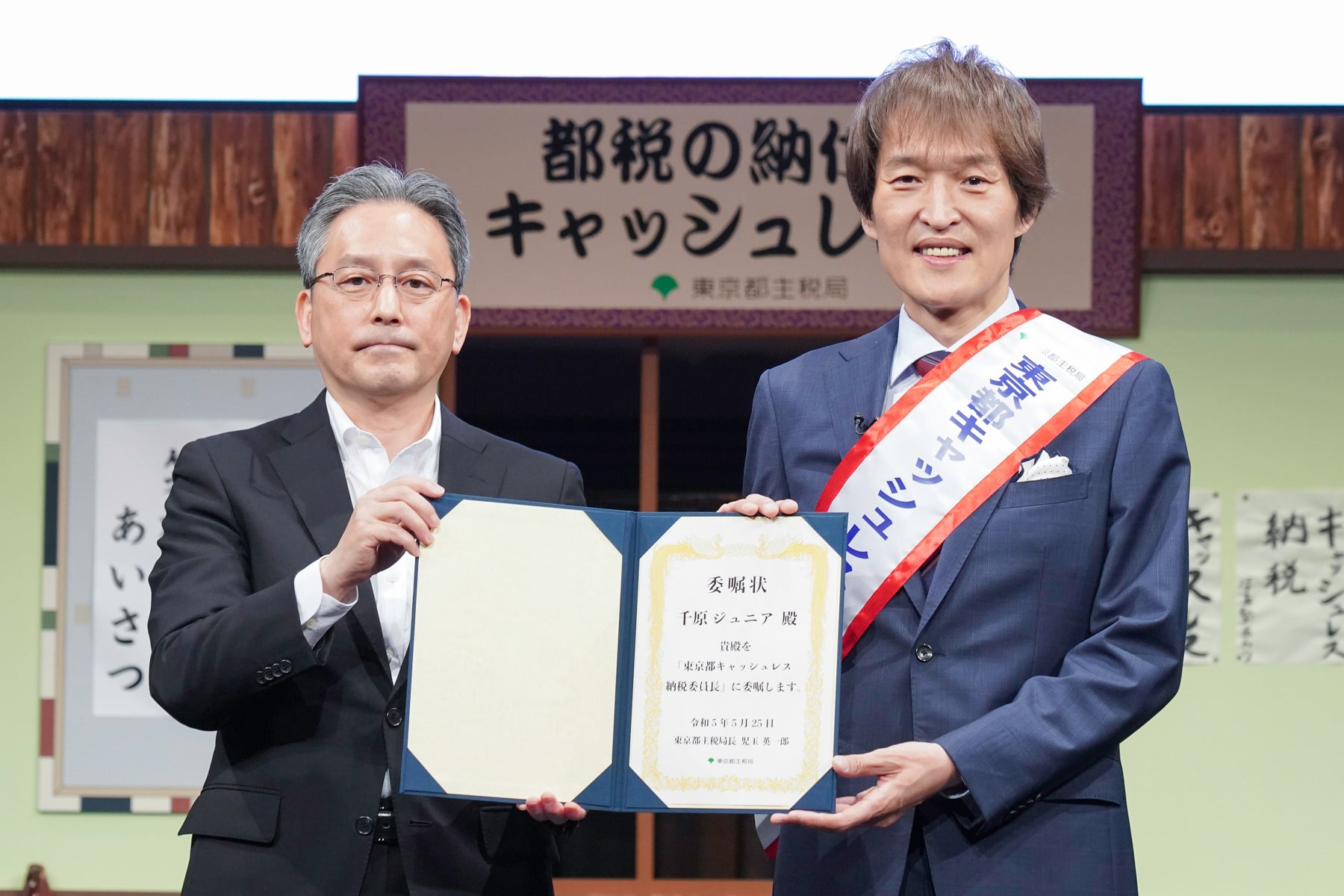 今回は、千原ジュニアが「東京都キャッシュレス納税委員長」に就任。児玉英一郎東京都主税局長より、委嘱状とタスキを受け取ったジュニアは「なぜ私なのでしょうか?」と笑わせつつ、以下のように述べました。