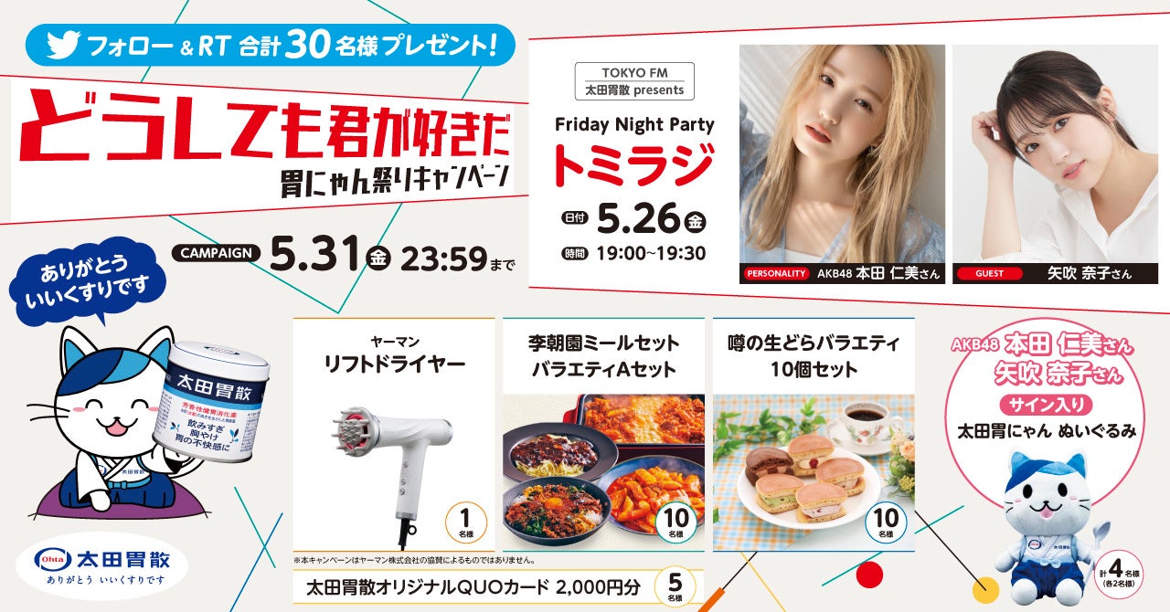 本キャンペーンは同社が提供しているTOKYO FM1ヶ月間限定プログラム『太田胃散 presents Friday Night Party トミラジ』(5月パーソナリティ:AKB48 本田仁美さん 毎週金曜日19:00~OA)とのコラボ企画となっておりますので、ぜひ番組もお聴きください。