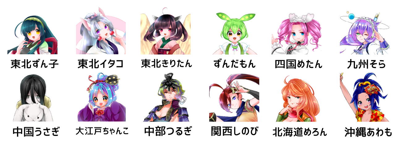 ※東北ずん子、東北イタコ、東北きりたん、ずんだもん、四国めたん、中国うさぎ、九州そら、大江戸ちゃん子、中部つるぎ、関西しのび、北海道めろん、沖縄あわも