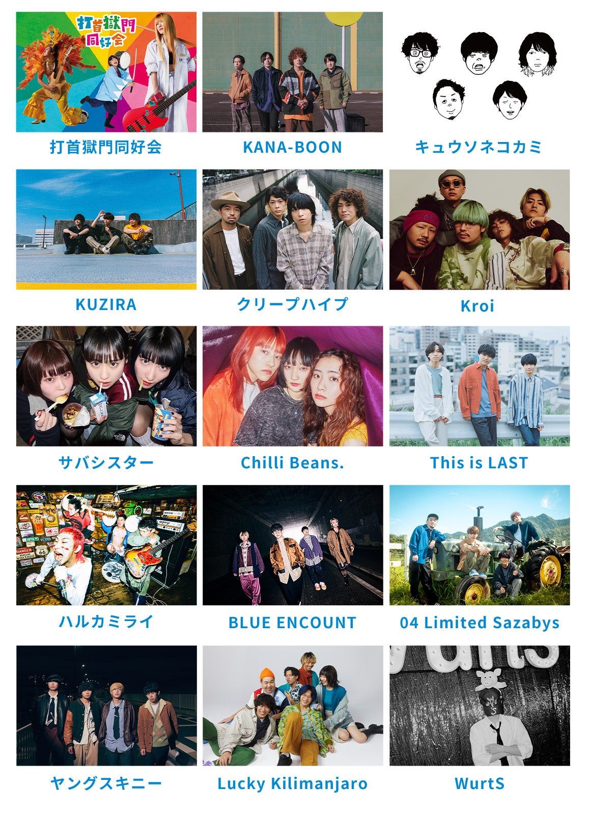 打首獄門同好会/KANA-BOON/キュウソネコカミ/KUZIRA/クリープハイプ/ Kroi /サバシスター/Chilli Beans./This is LAST/ハルカミライ/BLUE ENCOUNT/04 Limited Sazabys/ヤングスキニー/Lucky Kilimanjaro/WurtS/他