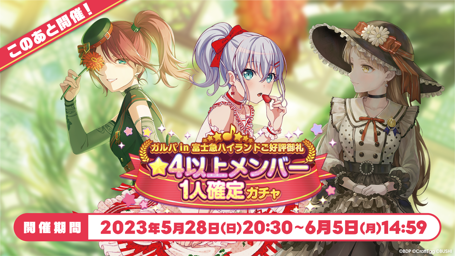 さらに、「ガルパ in 富士急ハイランドご好評御礼 ★4以上メンバー1人確定ガチャ」を、2023年5月28日(日) 20:30より開催します。