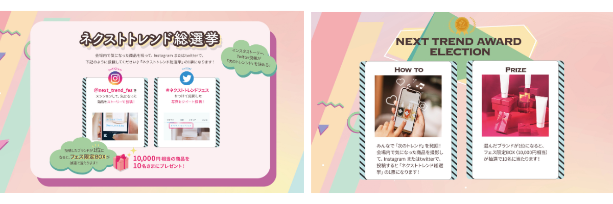 会場内では、次なる流行を決める「ネクストトレンド総選挙」を実施。InstagramまたはTwitterでこれからトレンドになりそうと思った商品の写真を投稿することで、参加することができます。一般来場者からインフルエンサーまでそれぞれがプロデューサーとなって、各ジャンルごとにネクストトレンドを決定しましょう!投稿は複数回OKのため、たくさん投稿するほど当選確率UP!結果はイベント最終日の4日(日)に、ステージにて発表します。