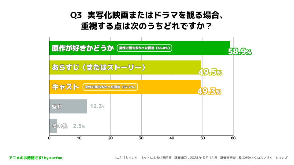 Q3 「原作が好きかどうか」を重視する人が58.9%で最も多い結果となりました。また、女性の場合は「キャスト」を重視する人が最も多くなりました(57.7%)。