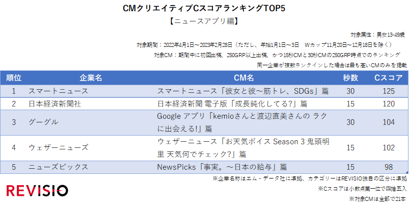 REVISIOは、「CMクリエイティブCスコアランキングTOP5【ニュースアプリ編】」を公開しました。