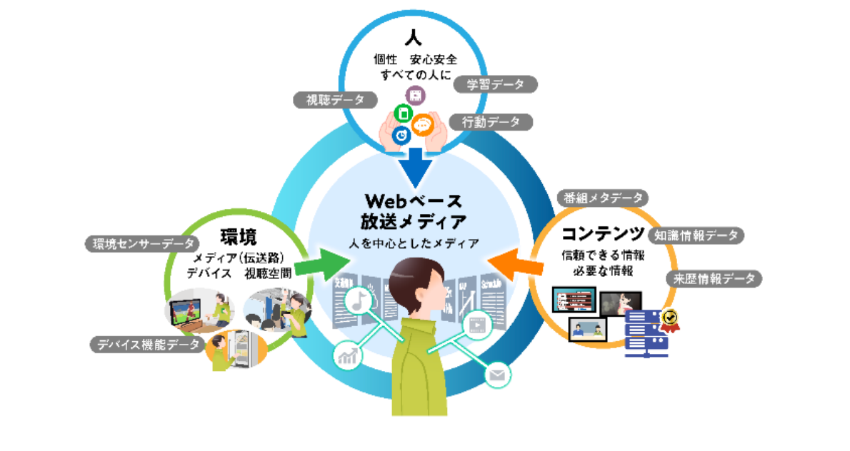 Webベース放送メディアとは、場面や目的に応じた方法でコンテンツを届ける視聴アプリケーションと、その動作を支えるデータ連携・処理技術や動画配信技術で構成される技術プラットフォームです。