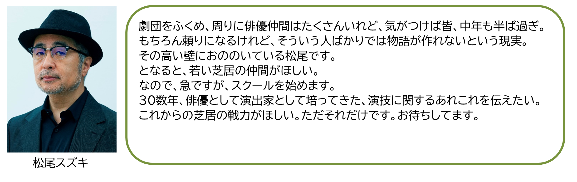 この度シアターコクーンで初となる演劇人のための学び場、COCOON PRODUCTION 『コクーン アクターズ スタジオ』を立ち上げます。当劇場の芸術監督・松尾スズキとともに、その就任時より構想していた“若手を対象とする演劇人の養成所”を通し、演劇界の未来を担う新たなスター誕生を目指します。