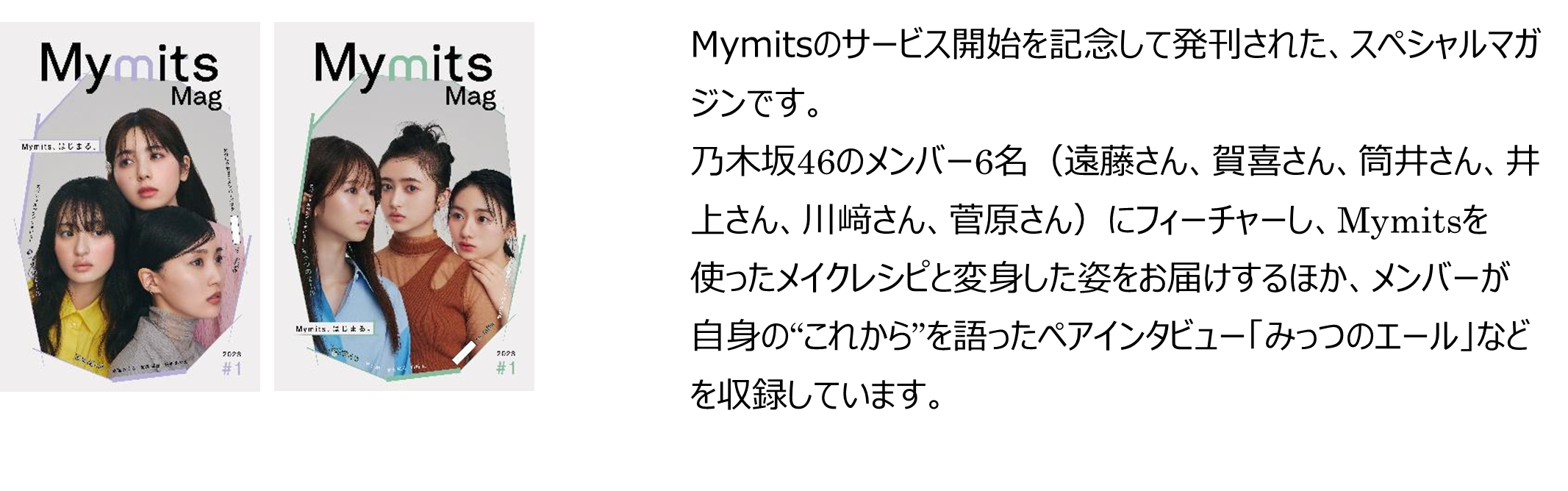 さらに3つのメイクアイテムのセット「Mymits Pack」をご購入いただいた方に、先着で「Mymits」のHow to本「Mymits Mag※」と「オリジナルテトラポーチ」をプレゼントします。「Mymits Mag」では、乃木坂46のメンバーたちがTV-CMとはひと味違うテーマの「Mymits」のメイクに挑戦し、日常でも取り入れやすい実践的なメイクテクニックが盛り込まれています。是非、ご注目ください。