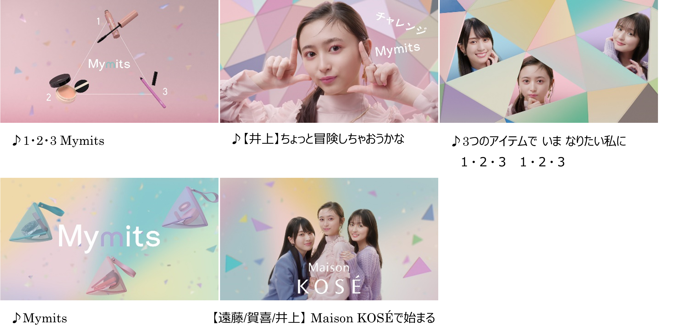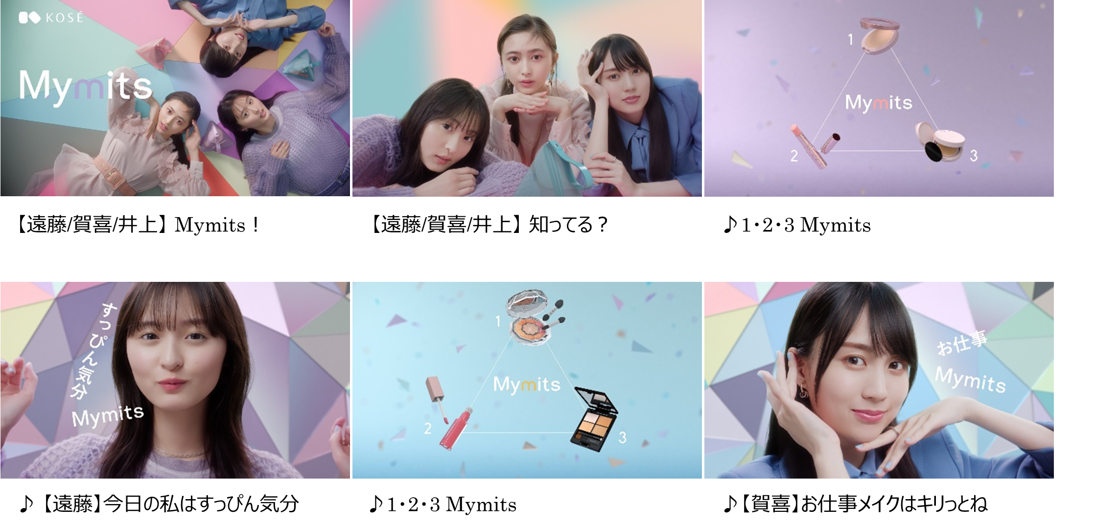 遠藤さんは、すっぴんのようなラフさの中に、かわいらしさの残る「#すっぴんMymits」、賀喜さんは、ヌケ感の中にきちんと感のある「#お仕事Mymits」、そして井上さんは、ピンクの色味で普段とは違う自分に冒険してみる「#チャレンジMymits」にそれぞれ挑戦。一度聴いたら頭から離れなくなるCMソングと共に、3人の普段とは違う雰囲気のメイクをお楽しみください。