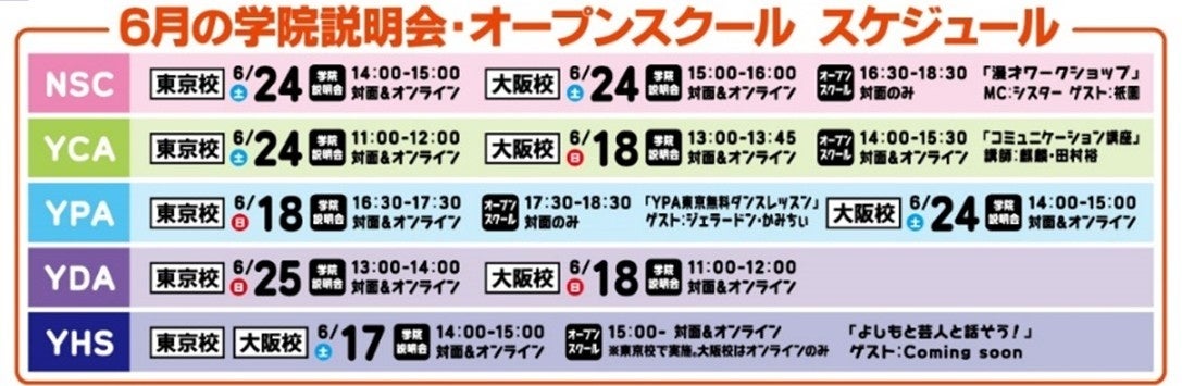 数多くのスターを輩出する国内最大規模のお笑い養成所NSC(吉本総合芸能学院)、マネージャー、構成作家、劇場・ライブプロデューサー、番組ディレクターetc…数多くの即戦力エンタテイメントスタッフを輩出するよしもとクリエイティブアカデミー(YCA)、俳優、パフォーマー、歌手、よしもとから“本格的”にデビューを目指すタレント養成所よしもとパフォーミングアカデミー(YPA)、よしもとでエンタメ×デジタルの最前線を学び即戦力を目指すスクールよしもとデジタルエンタテインメントアカデミー(YDA)、よしもとのスクールでエンタメを学び高校卒業資格が取れるよしもとの高校、吉本興業高等学院。これら5校からなる吉本興業グループの唯一の教育機関であるよしもとアカデミー。東京校においては池袋サンシャインシティ内に校舎を移転し、充実した施設にてエンタテインメント業界でさらなる活躍をする人材を育成しております。