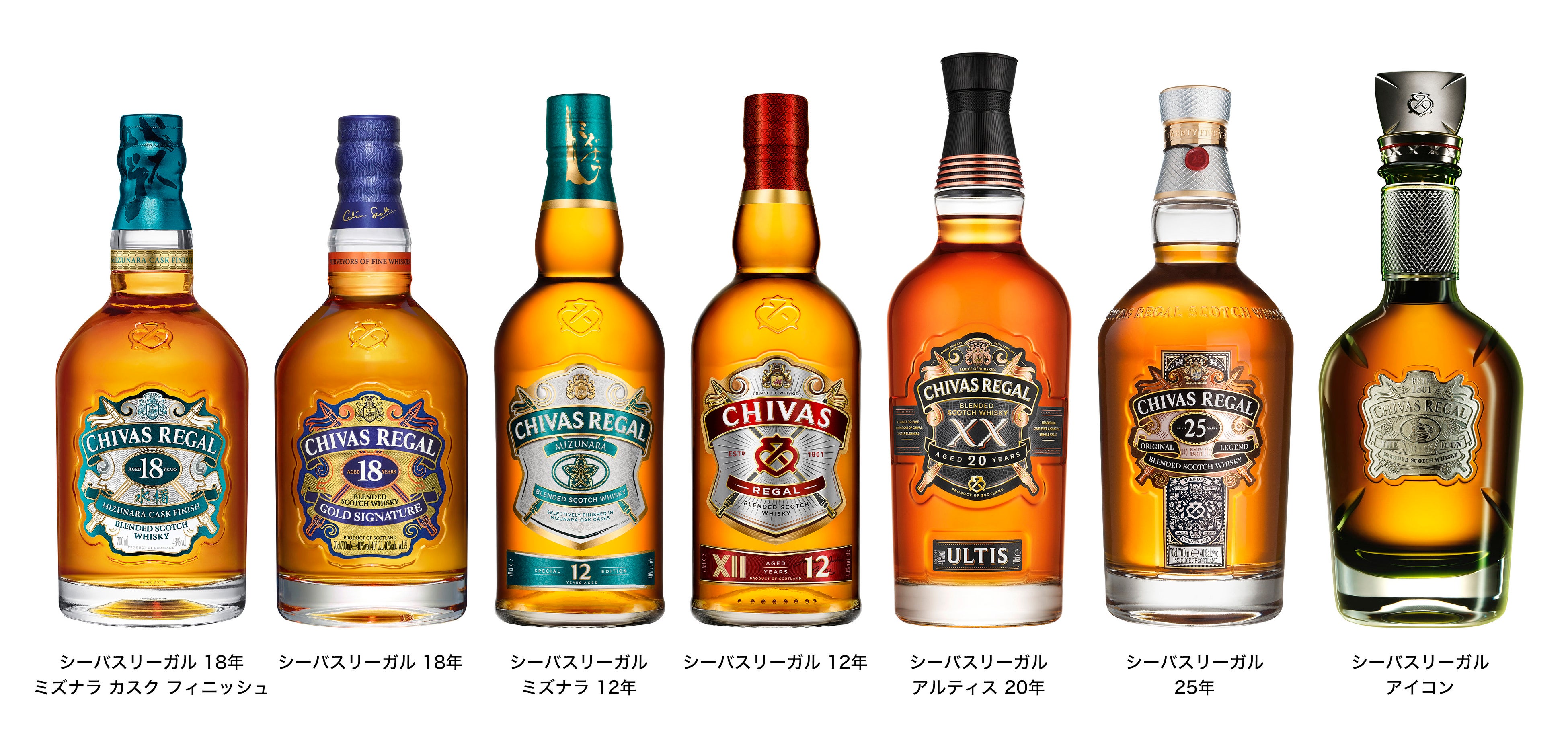 シーバスリーガルの故郷はスコットランドのスペイサイド。日本では「シーバスリーガル 12年」をはじめ、「シーバスリーガル ミズナラ12年」、「シーバスリーガル 18年」、 「シーバスリーガル 18年 ミズナラ カスク フィニッシュ」、「シーバスリーガル アルティス20年」、「シーバスリーガル 25年」、「シーバスリーガル アイコン」の7アイテムを主に展開しています。