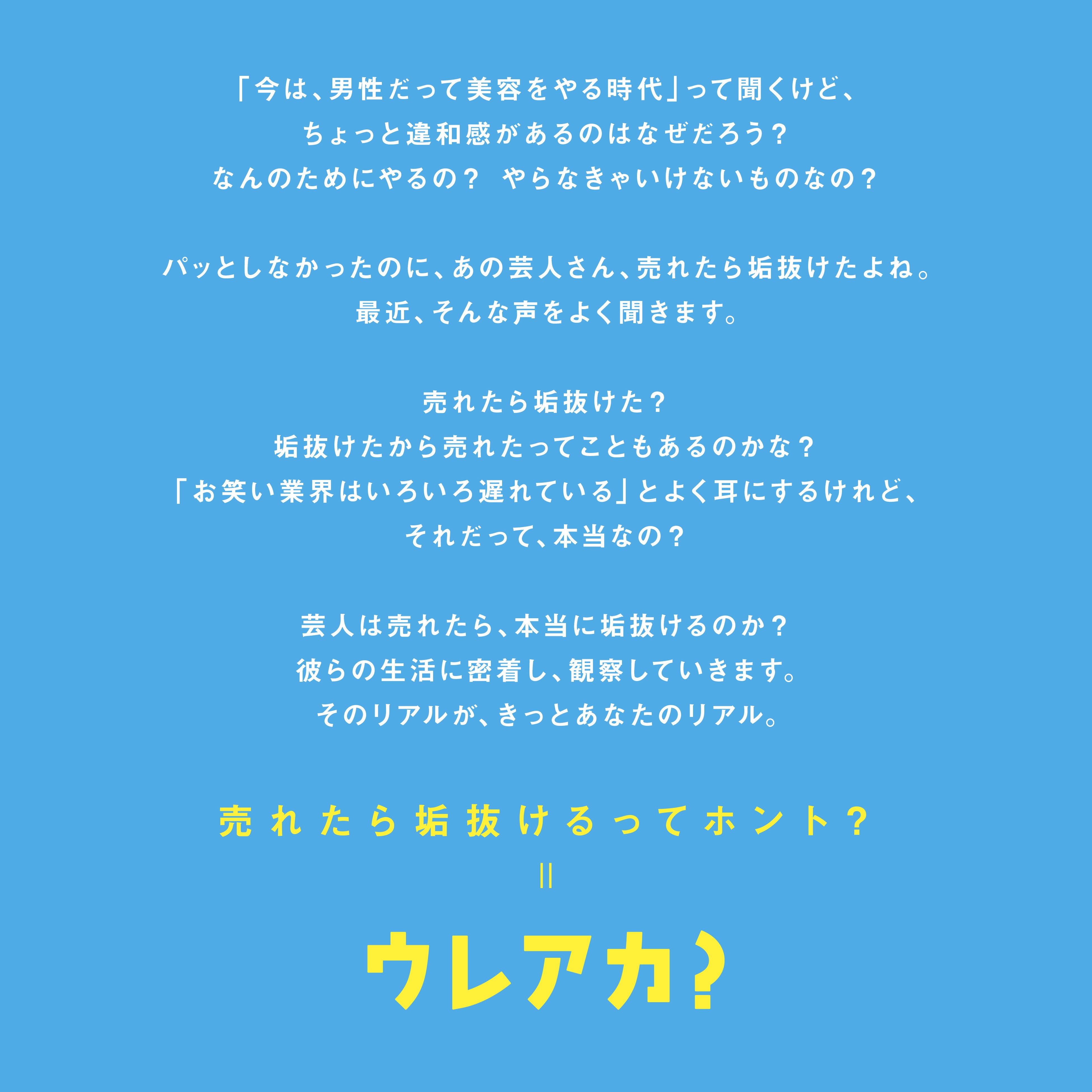 「恥ずかしい、面倒くさい、必要ない」。とりわけ美容に抵抗感のある男性はそう語ります。自分という素材自体が商売道具。身ひとつで、人前に立ち、笑い、そして時代と対峙する若手芸人の背中を追うことで、「美容は、無用なのか、有益なのか?」。価値観が揺れ惑う今、問いかけていきます。