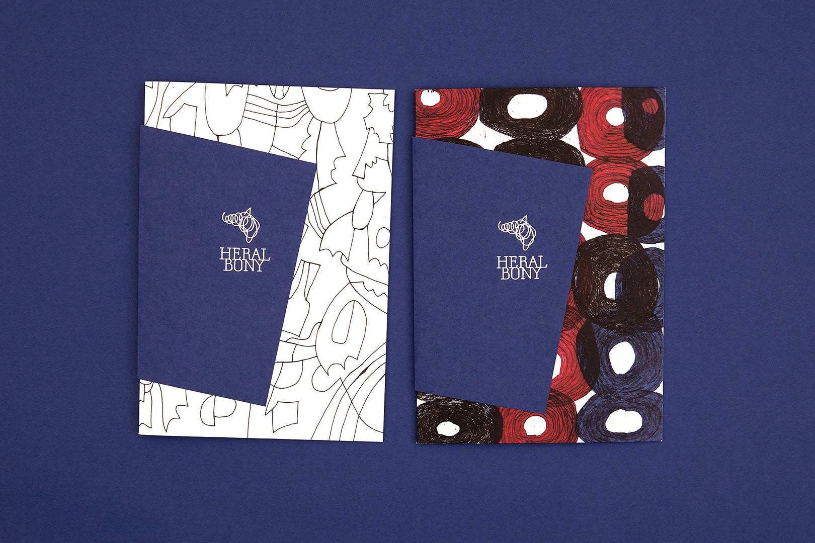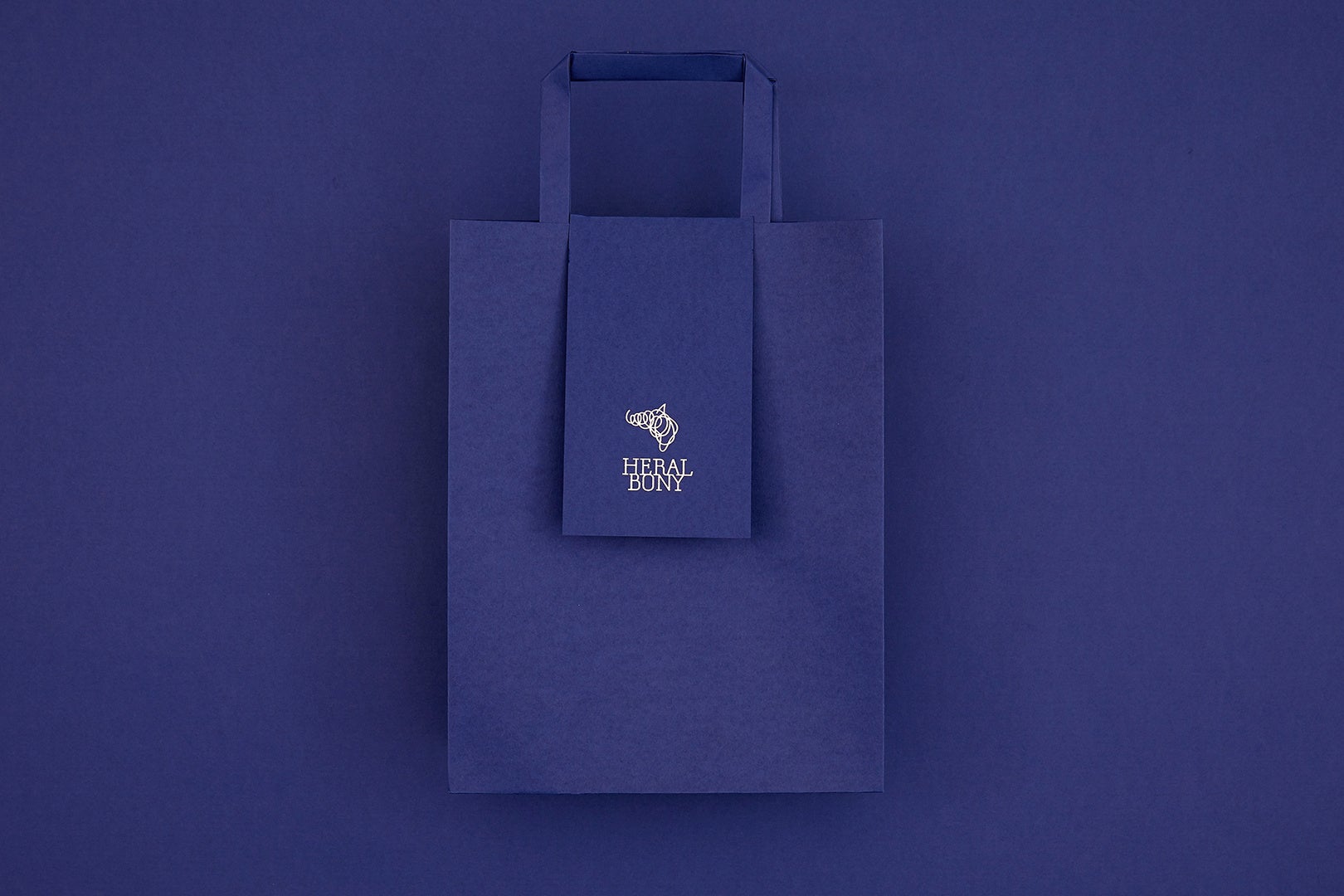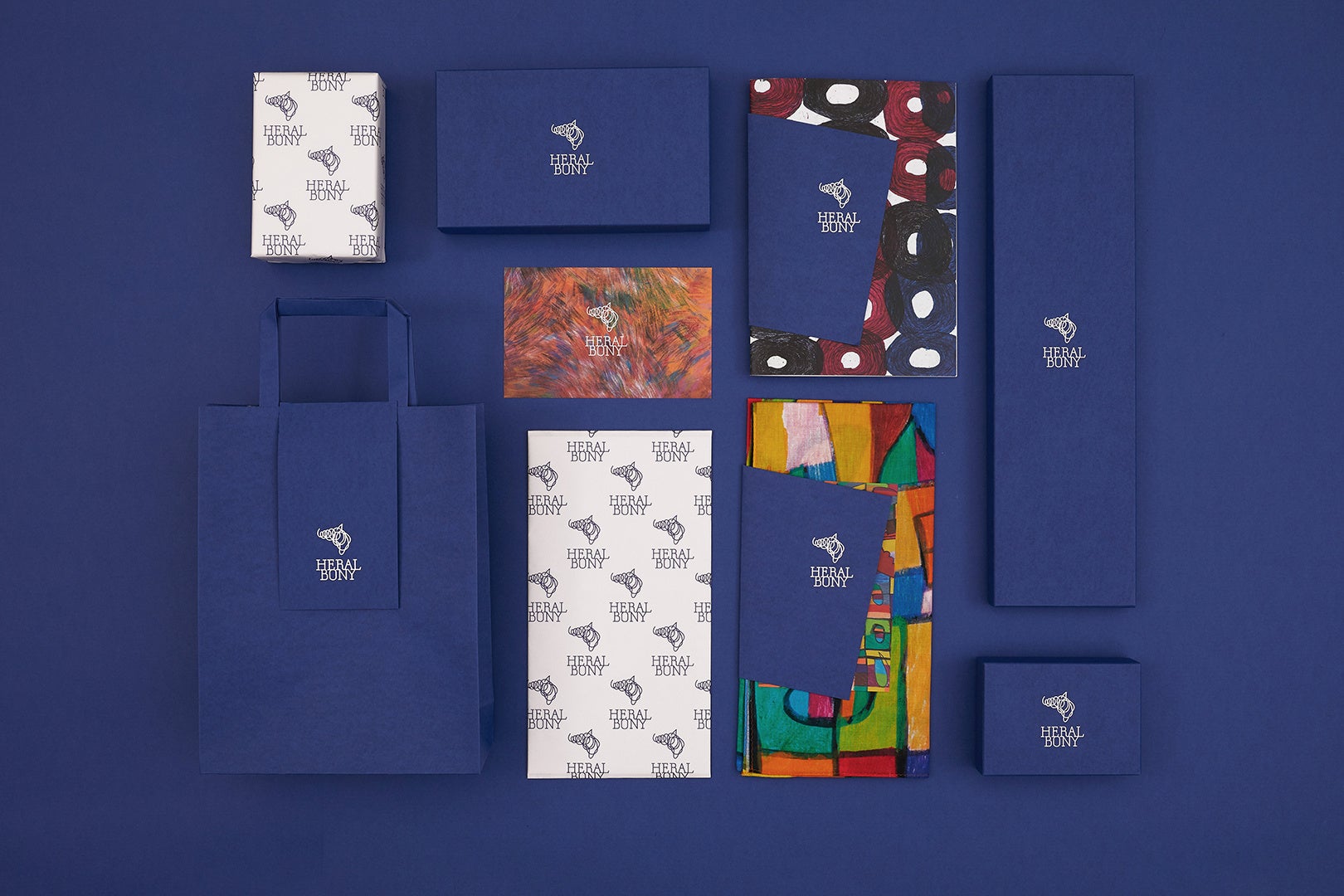 ヘラルボニーは、アートライフスタイルブランド「HERALBONY」を確立するために、デザインチームPaper Paradeと共に、ブランドの「色」とブランドペーパーの「素材」を決定。色は自閉症・発達障害啓発のシンボルカラーであり、癒し、希望を意味する「ブルー」に。素材は、アートという上質さを顧客に伝えられる「質感」を兼ね備えた紙として、竹尾の「ビオトープGA-FS マゼランブルー」を使用しました。